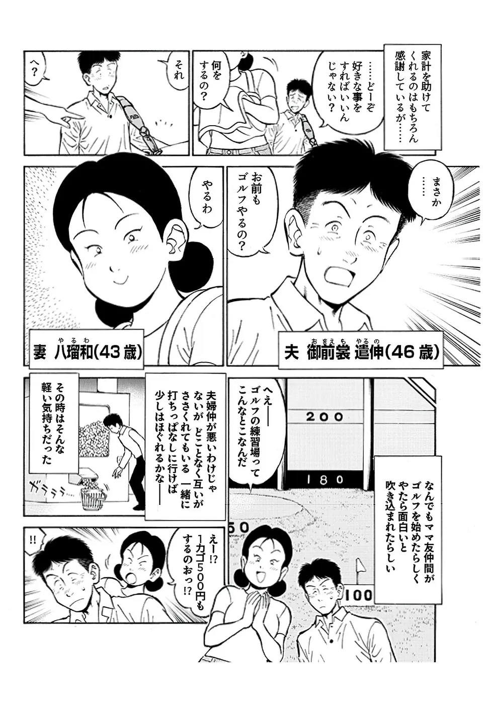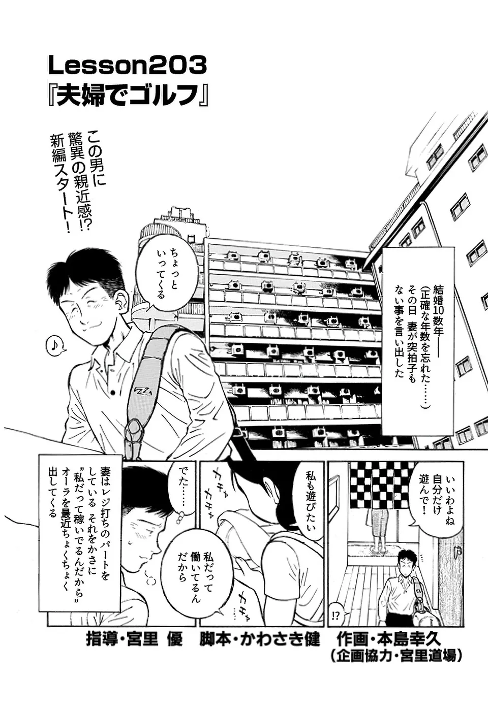 【夫婦でゴルフ編|シリーズ概要】結婚してから10数年、ふとしたタイミングで妻が「ゴルフをしたい」と言い出した。経験者の夫が抱いた夫婦で楽しめたら、という淡い期待は露と消え、クラブを握れば喧嘩ばかり。するとなんと、夫に愛想を尽かした妻がこっそりと宮里道場に通い始めた!(指導:宮里優/脚本:かわさき健/作画:本島幸久)※毎週月・水・金更新予定