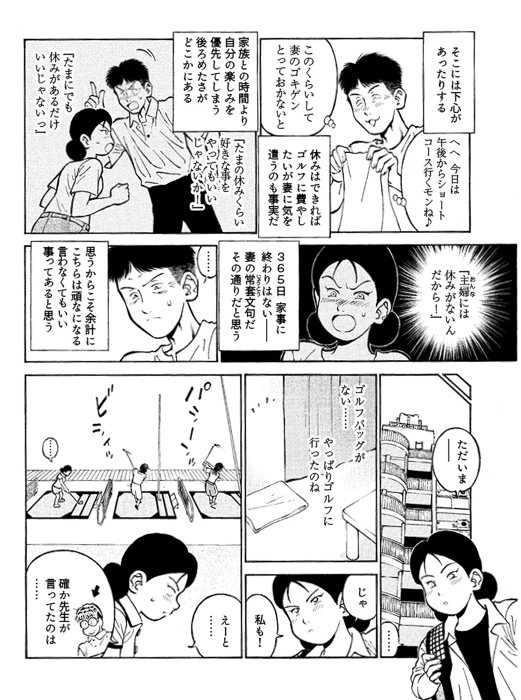 【夫婦でゴルフ編|シリーズ概要】結婚してから10数年、ふとしたタイミングで妻が「ゴルフをしたい」と言い出した。経験者の夫が抱いた夫婦で楽しめたら、という淡い期待は露と消え、クラブを握れば喧嘩ばかり。するとなんと、夫に愛想を尽かした妻がこっそりと宮里道場に通い始めた!(指導:宮里優/脚本:かわさき健/作画:本島幸久)※毎週月・水・金更新予定