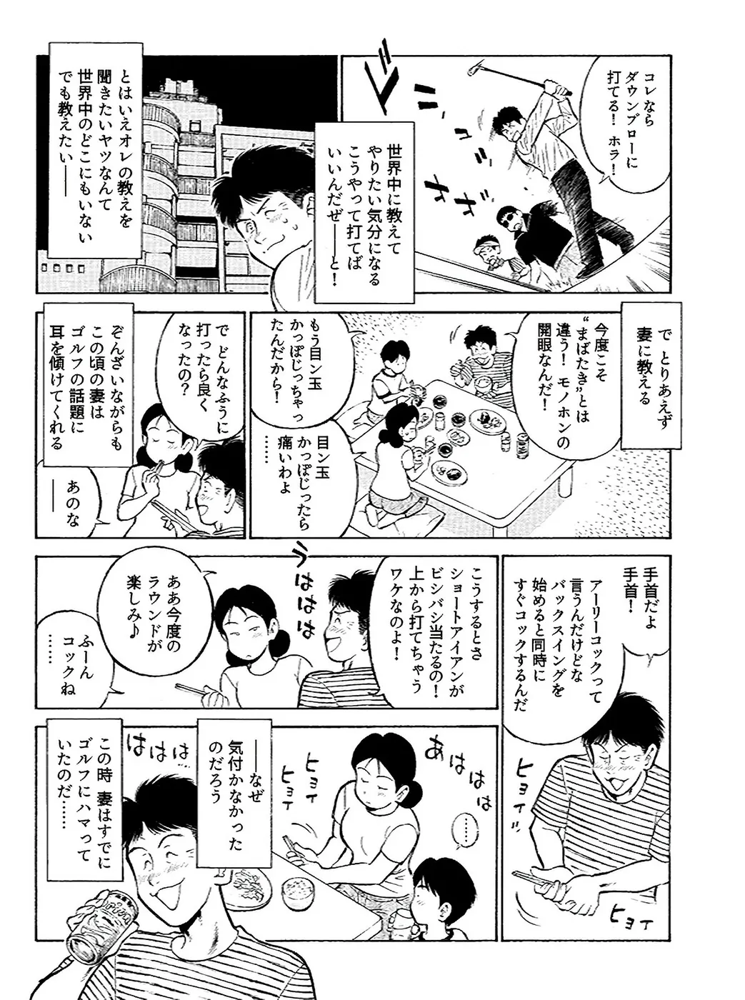 【夫婦でゴルフ編|シリーズ概要】結婚してから10数年、ふとしたタイミングで妻が「ゴルフをしたい」と言い出した。経験者の夫が抱いた夫婦で楽しめたら、という淡い期待は露と消え、クラブを握れば喧嘩ばかり。するとなんと、夫に愛想を尽かした妻がこっそりと宮里道場に通い始めた!(指導:宮里優/脚本:かわさき健/作画:本島幸久)※毎週月・水・金更新予定