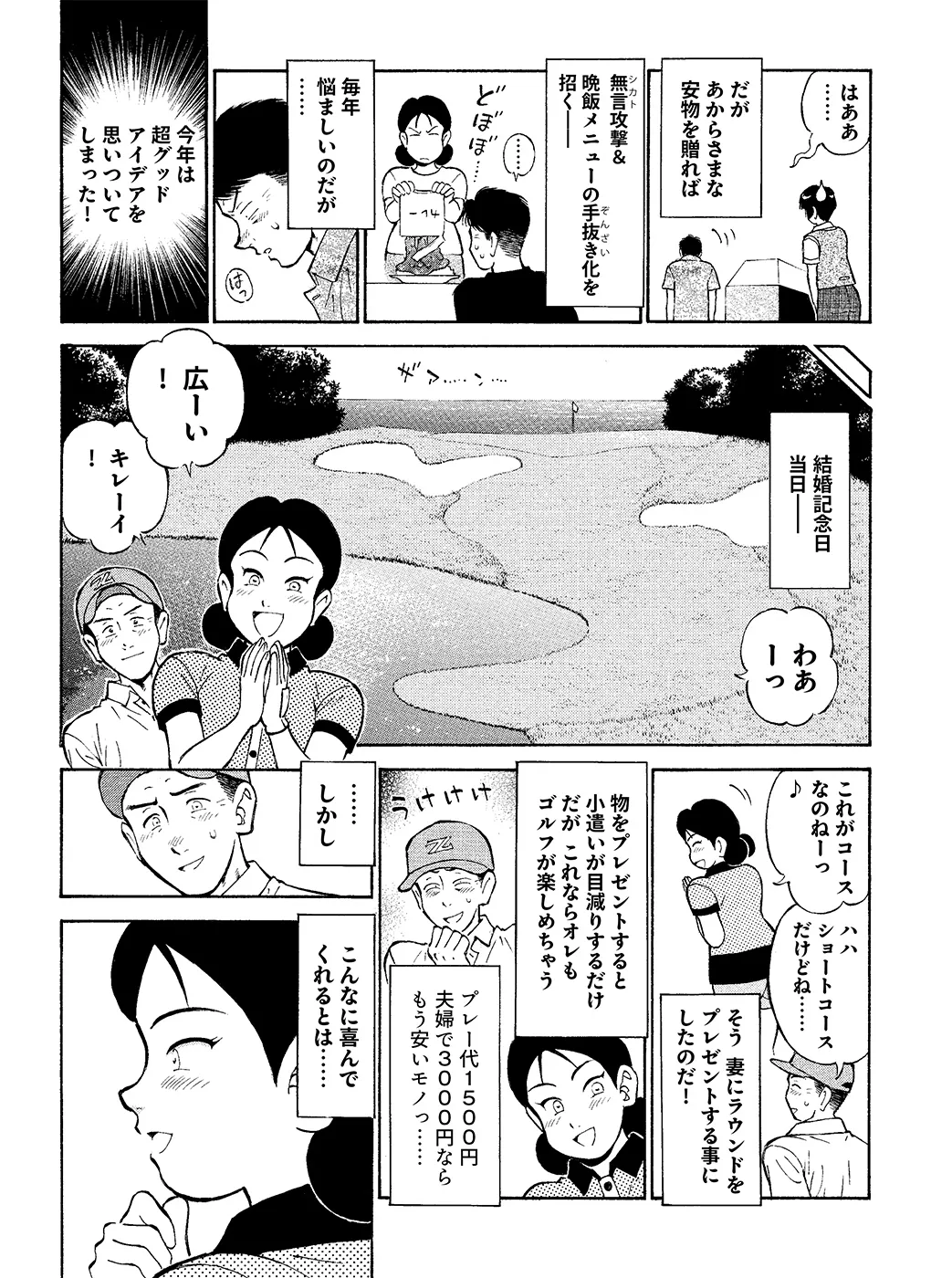 【夫婦でゴルフ編|シリーズ概要】結婚してから10数年、ふとしたタイミングで妻が「ゴルフをしたい」と言い出した。経験者の夫が抱いた夫婦で楽しめたら、という淡い期待は露と消え、クラブを握れば喧嘩ばかり。するとなんと、夫に愛想を尽かした妻がこっそりと宮里道場に通い始めた!(指導:宮里優/脚本:かわさき健/作画:本島幸久)※毎週月・水・金更新予定