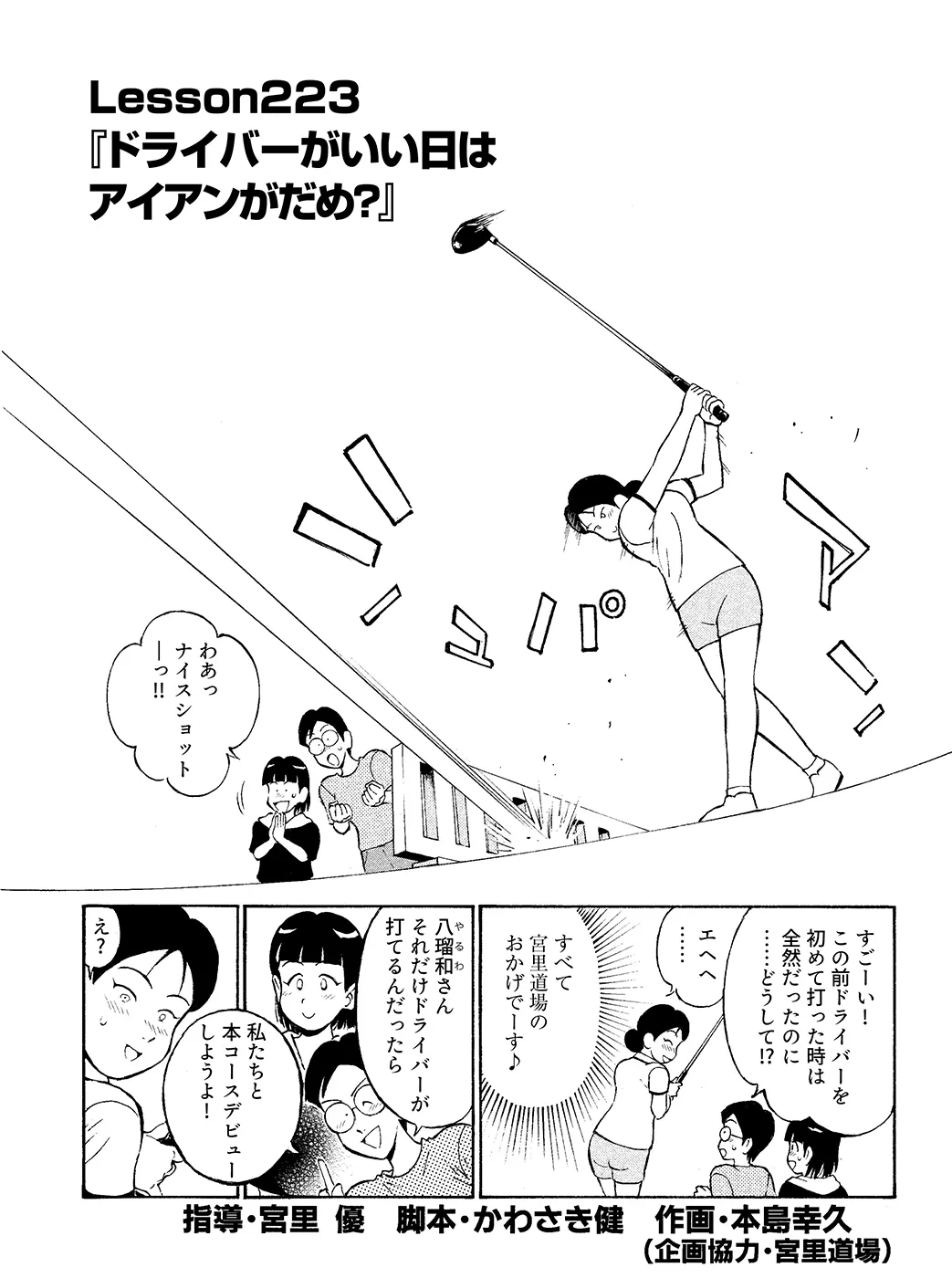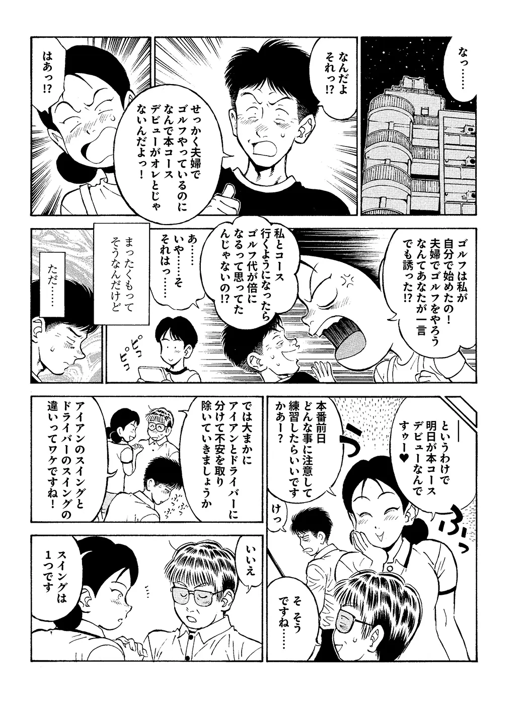 【夫婦でゴルフ編|シリーズ概要】結婚してから10数年、ふとしたタイミングで妻が「ゴルフをしたい」と言い出した。経験者の夫が抱いた夫婦で楽しめたら、という淡い期待は露と消え、クラブを握れば喧嘩ばかり。するとなんと、夫に愛想を尽かした妻がこっそりと宮里道場に通い始めた!(指導:宮里優/脚本:かわさき健/作画:本島幸久)※毎週月・水・金更新予定