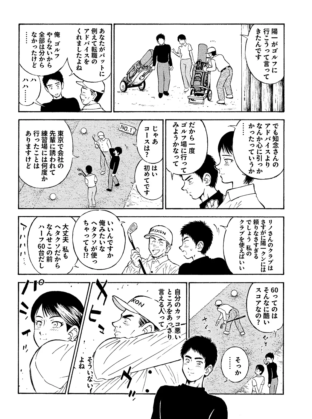 【もう一度、ゴルフ!編|シリーズ概要】転職に失敗し、40代前半にして無職に。再就職もままならず家庭も崩壊。ゴルフとは随分と縁のない生活をしていたが……恋をしてしまった。まさかその人がゴルフをするなんて。もう一度、クラブを握るのもありかもしれない。(指導:宮里優/脚本:かわさき健/作画:本島幸久)※毎週月・水・金更新予定