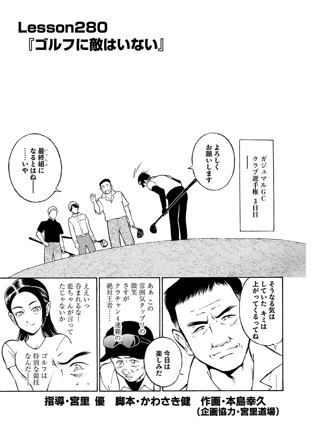 【めんそーれ競技ゴルフ 編|シリーズ概要】ゴルフ歴は30年。独学で平均70台まで上達した。子供の独り立ちを機に、意を決してゴルフ場のメンバーに。ハンデも取得し、いざ研修会へ。ーーコテンパンにやられた。次の研修会が怖い。このままじゃ、ダメだ!(指導:宮里優/脚本:かわさき健/作画:本島幸久)※毎週月・水・金更新予定