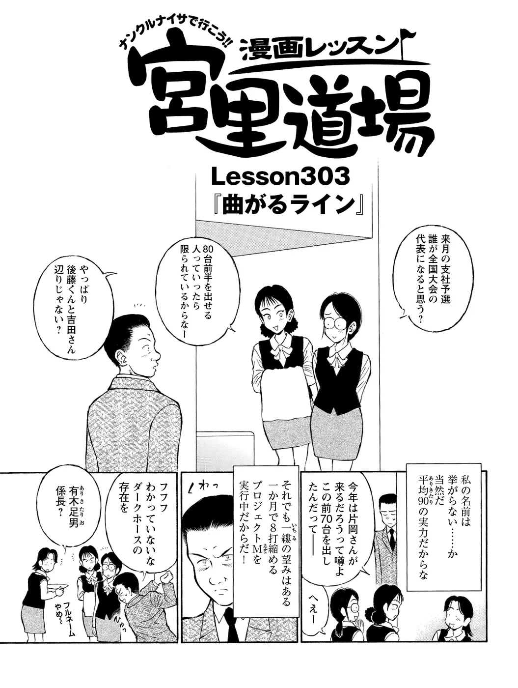 【平均ゴルファーからの脱皮編|シリーズ概要】ゴルフも私生活も、何もかも普通な46歳・有木足男(ありきたりお)。ゴルフが盛んな会社で一目置かれるために、意を決して宮里道場に入門! 目標は平均スコア-8打、許された時間はたったの1ヶ月。さあ、どうする!?(指導:宮里優/脚本:かわさき健/作画:本島幸久)※毎週月・水・金更新予定
