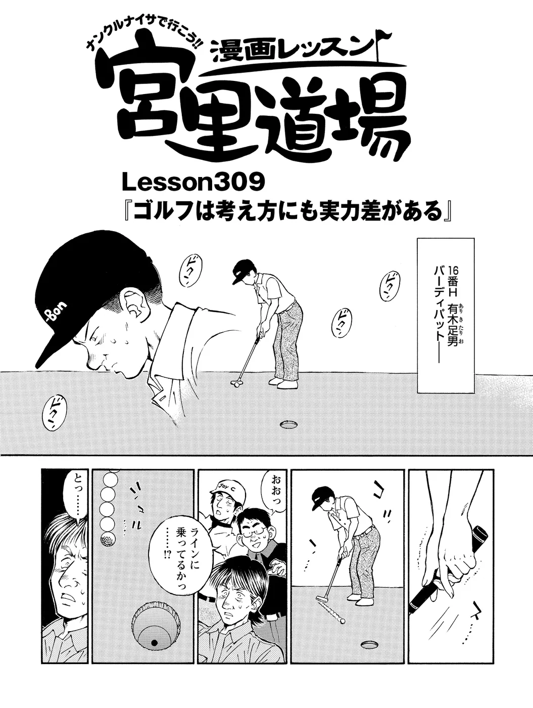 【平均ゴルファーからの脱皮編|シリーズ概要】ゴルフも私生活も、何もかも普通な46歳・有木足男(ありきたりお)。ゴルフが盛んな会社で一目置かれるために、意を決して宮里道場に入門! 目標は平均スコア-8打、許された時間はたったの1ヶ月。さあ、どうする!?(指導:宮里優/脚本:かわさき健/作画:本島幸久)※毎週月・水・金更新予定