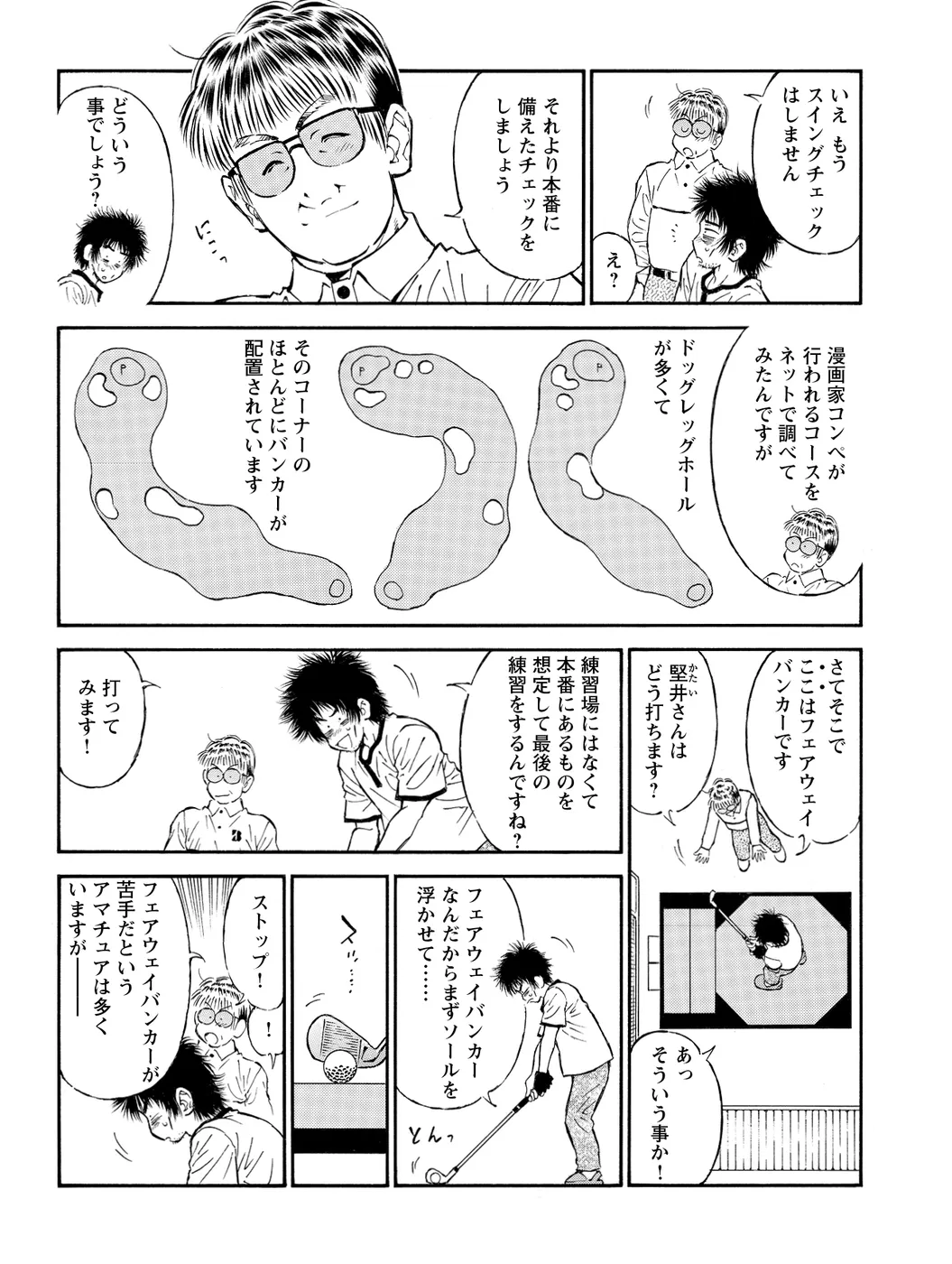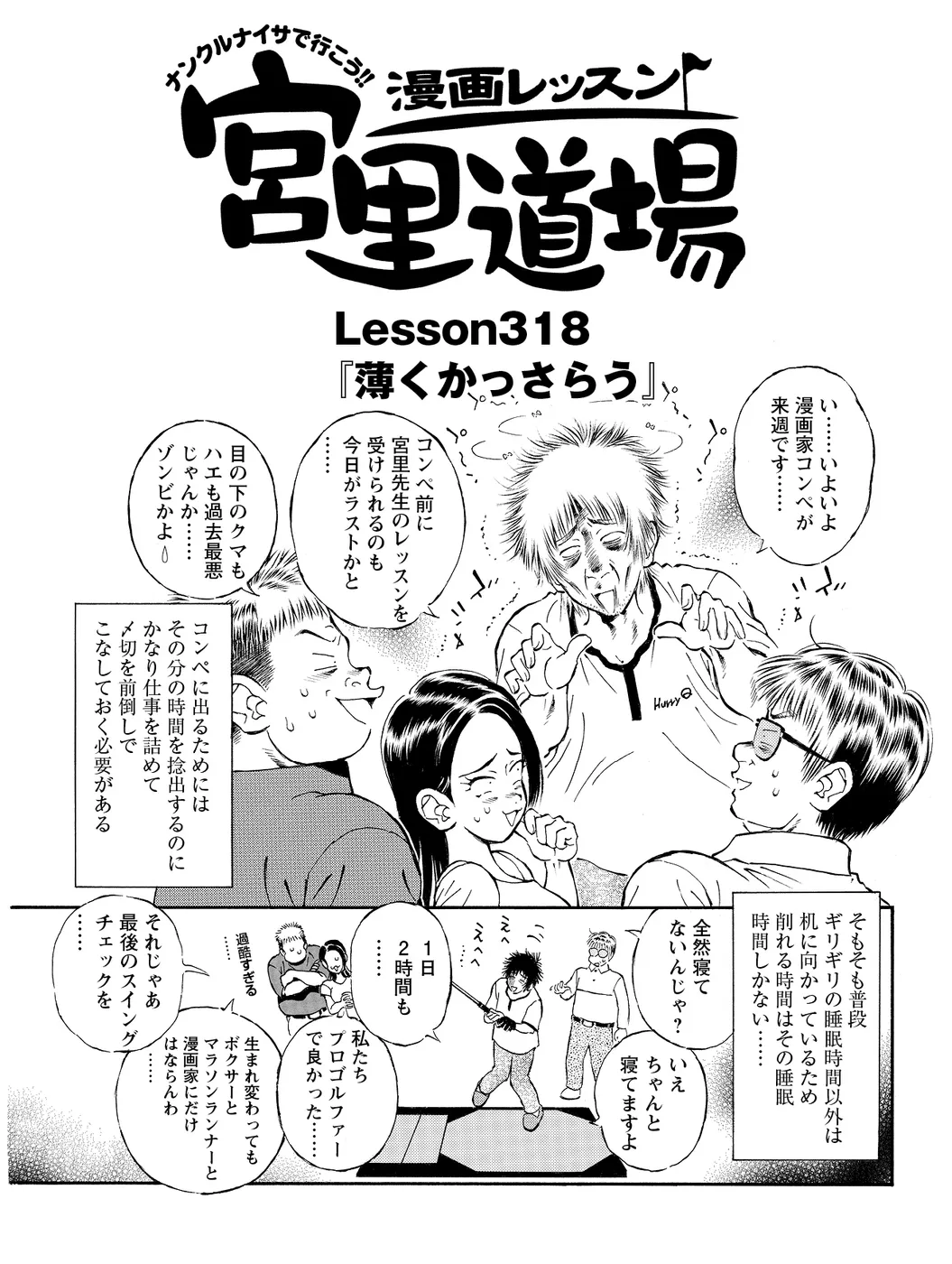 【体が硬くてクラブが振れない…編|シリーズ概要】仕事はひたすら前かがみの同じ姿勢。1日18時間座りっぱなしなんてこともザラ。気づいたら信じられないほど体が硬くなっていた! 学生時代のゴルフ経験がむしろ邪魔をする有様で……。こんな人は、どうすれば!?(指導:宮里優/脚本:かわさき健/作画:本島幸久)
