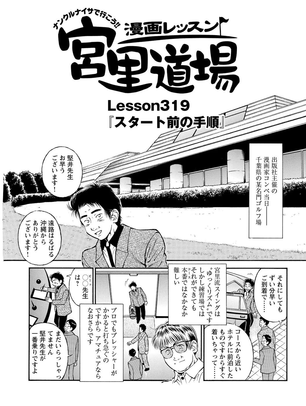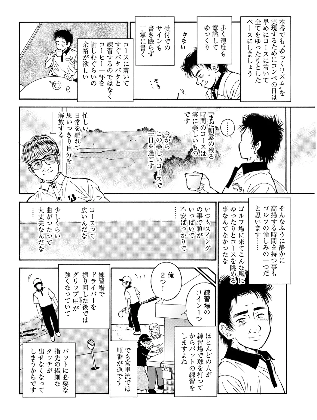【体が硬くてクラブが振れない…編|シリーズ概要】仕事はひたすら前かがみの同じ姿勢。1日18時間座りっぱなしなんてこともザラ。気づいたら信じられないほど体が硬くなっていた! 学生時代のゴルフ経験がむしろ邪魔をする有様で……。こんな人は、どうすれば!?(指導:宮里優/脚本:かわさき健/作画:本島幸久)