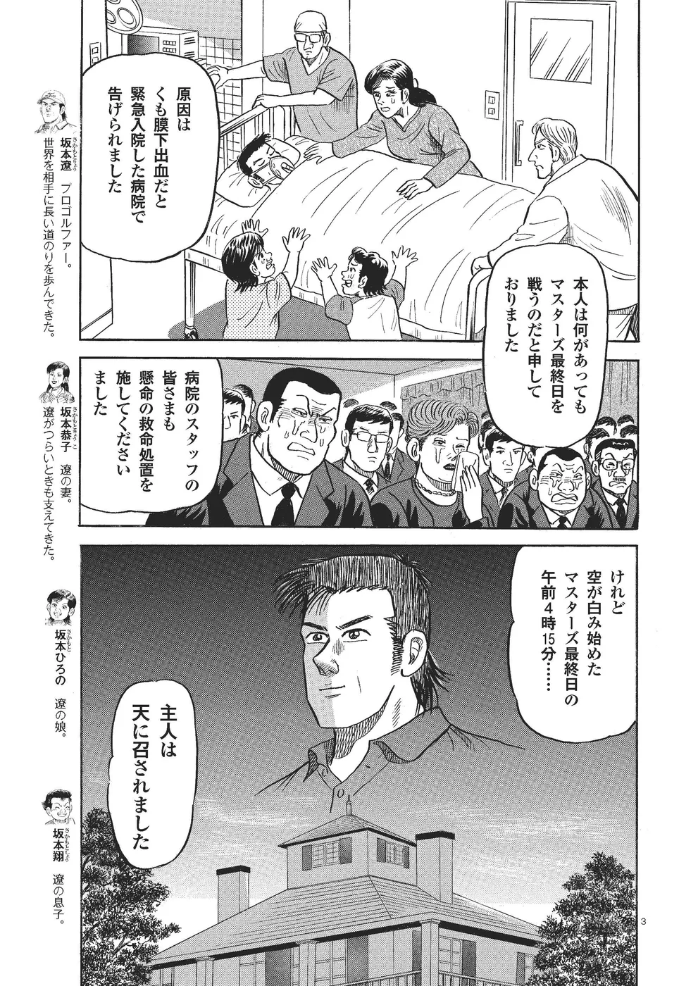 マスターズで初日から首位を独走した坂本遼だが、3日目の夜に激しい頭痛に襲われ、くも膜下出血でこの世を去った。その息子・坂本翔が18歳になり、父親の無念を晴らすべく、日本ツアーの出場権を懸けたファイナルクォリファイングトーナメント(QT)に挑戦!【毎週月・木曜日更新予定】