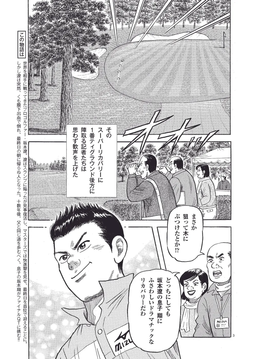 マスターズで初日から首位を独走した坂本遼だが、3日目の夜に激しい頭痛に襲われ、くも膜下出血でこの世を去った。その息子・坂本翔が18歳になり、父親の無念を晴らすべく、日本ツアーの出場権を懸けたファイナルクォリファイングトーナメント(QT)に挑戦!【毎週月・木曜日更新予定】