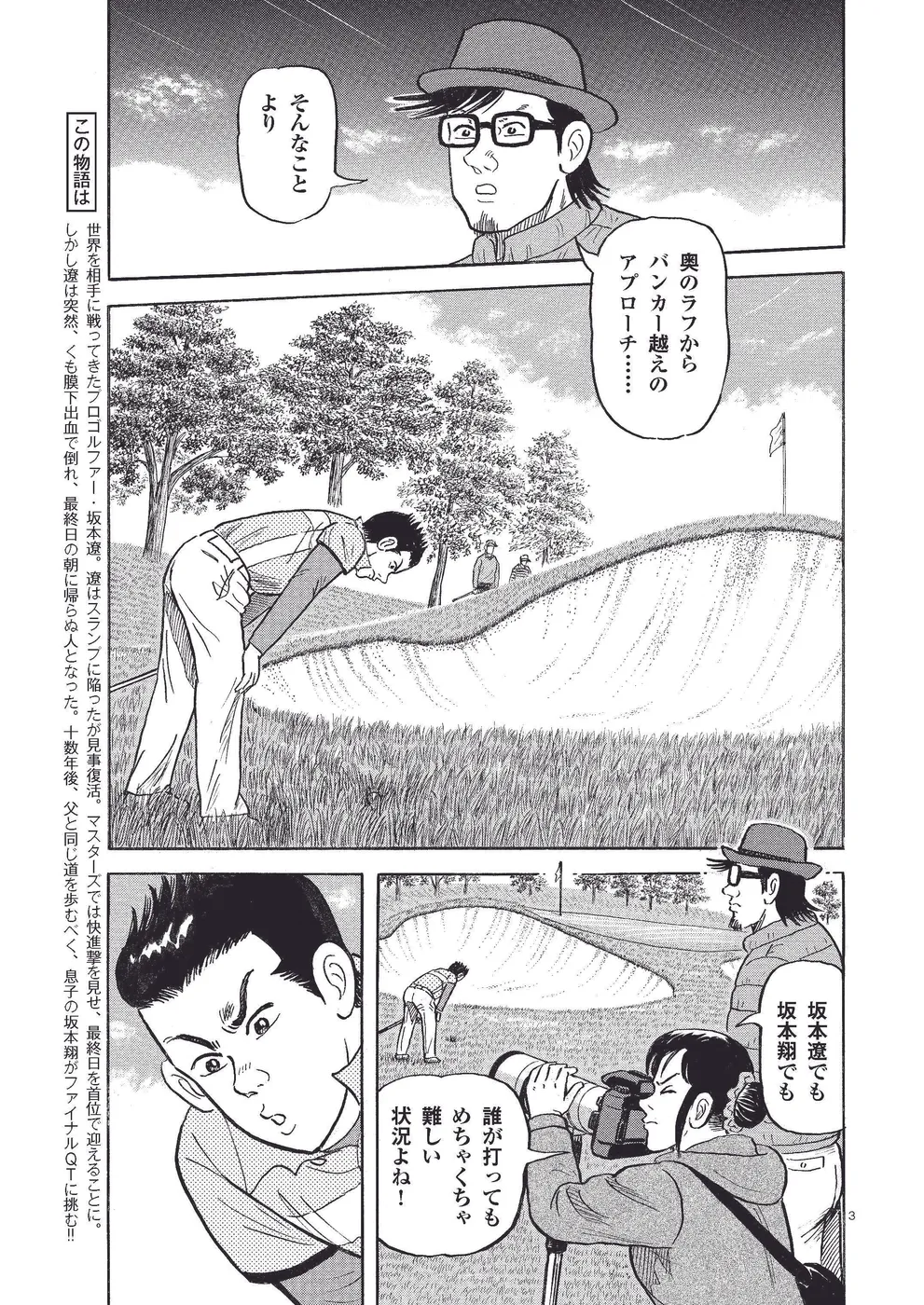 マスターズで初日から首位を独走した坂本遼だが、3日目の夜に激しい頭痛に襲われ、くも膜下出血でこの世を去った。その息子・坂本翔が18歳になり、父親の無念を晴らすべく、日本ツアーの出場権を懸けたファイナルクォリファイングトーナメント(QT)に挑戦!【毎週月・木曜日更新予定】