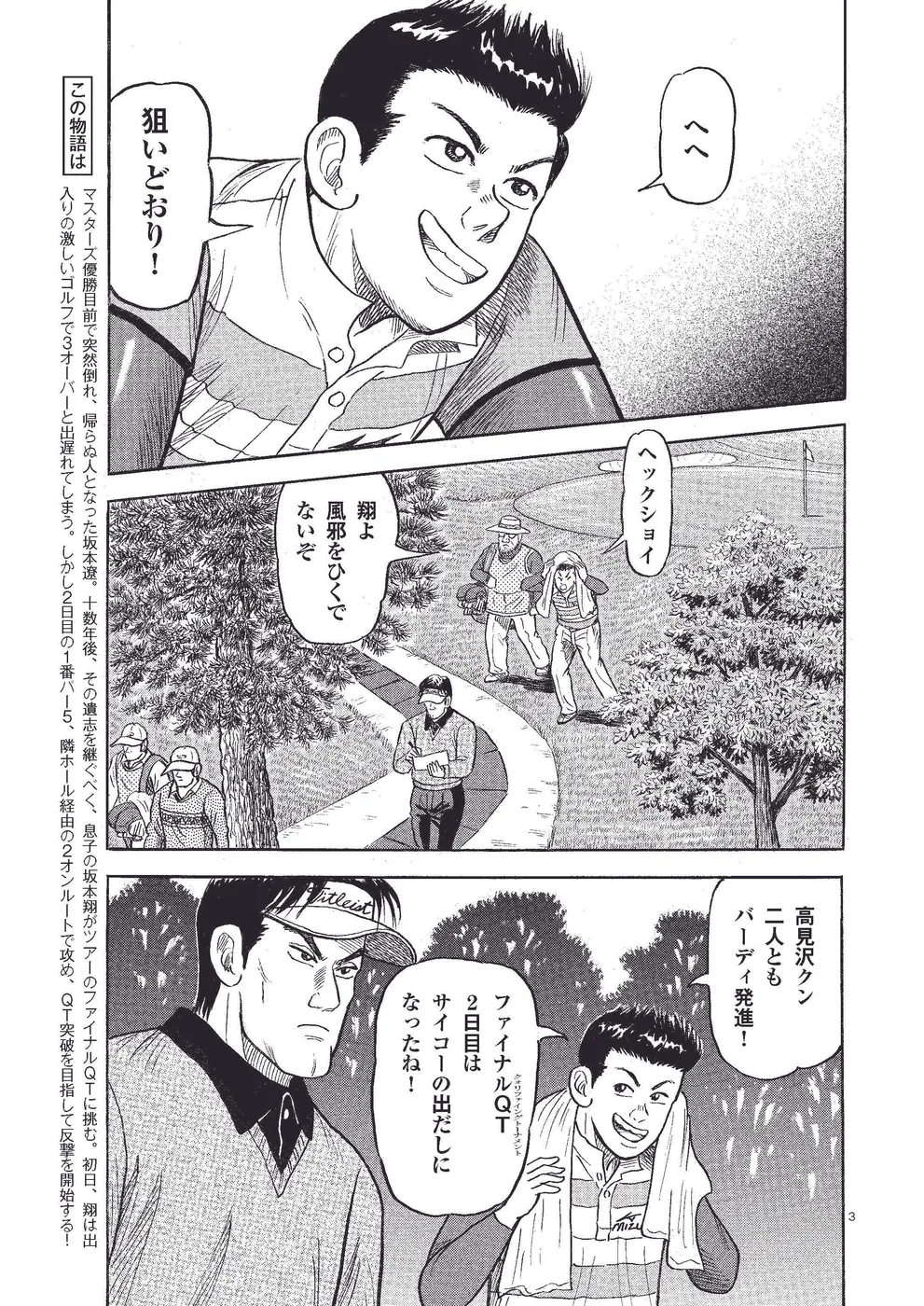 マスターズで初日から首位を独走した坂本遼だが、3日目の夜に激しい頭痛に襲われ、くも膜下出血でこの世を去った。その息子・坂本翔が18歳になり、父親の無念を晴らすべく、日本ツアーの出場権を懸けたファイナルクォリファイングトーナメント(QT)に挑戦!【毎週月・木曜日更新予定】