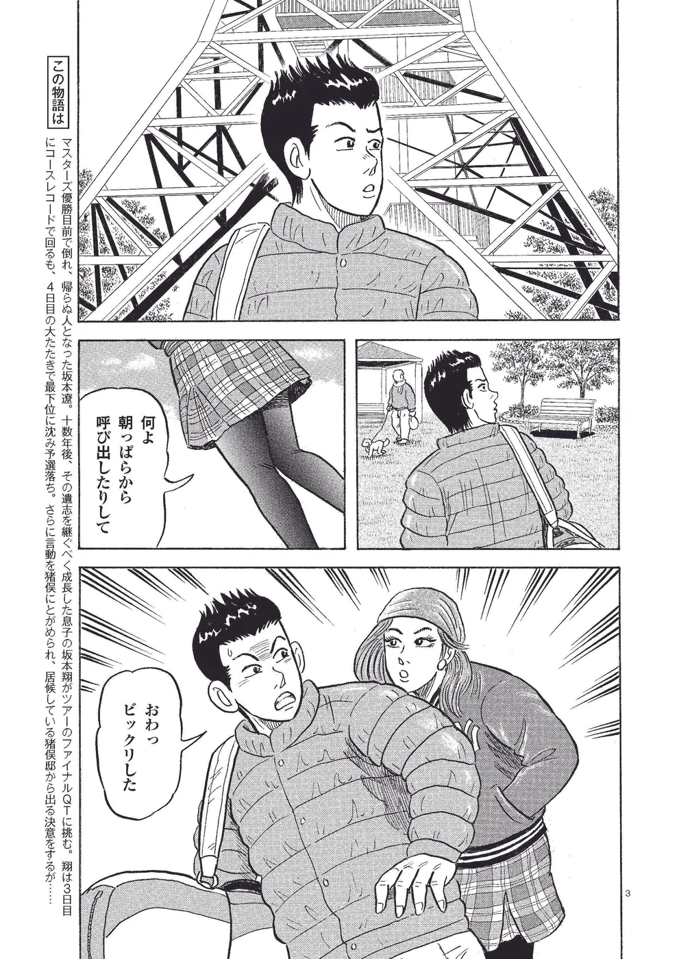 マスターズ優勝目前で倒れ、帰らぬ人となった坂本遼。十数年後、その遺志を継ぐべく成長した息子の坂本翔がツアーのファイナルQTに挑む。翔は3日目にコースレコードで回るも、4日目の大たたきで最下位に沈み予選落ち。さらに言動を猪俣にとがめられ、居候している猪俣邸から出る決意をするが……【毎週月・木曜日更新予定】