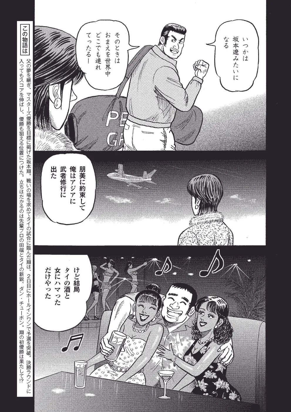 父の夢を継ぎ、マスターズ優勝を目標に掲げた坂本翔。戦いの場を求めてタイの試合に臨んだ翔は、2日目にホールインワンで予選を突破。決勝ラウンドに入ってもスコアを伸ばし、優勝も狙える位置につけた。立ちはだかるのは先輩プロの田端とタイの新鋭、ダン・チューポン。翔の初優勝は果たして!?