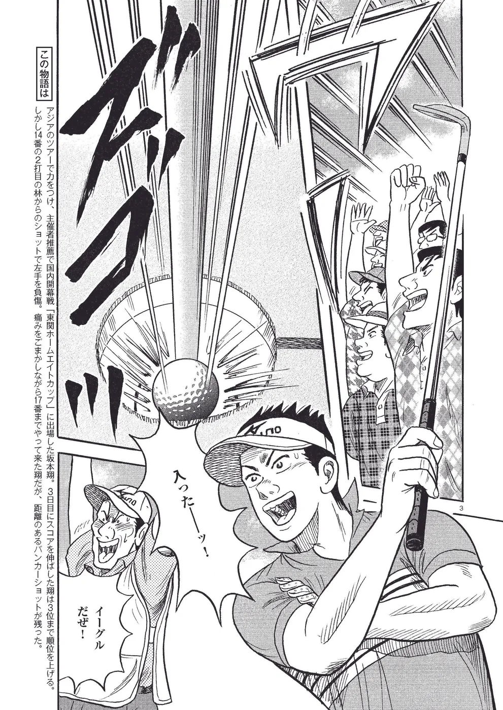 アジアのツアーで力をつけ、主催者推薦で国内開幕戦「東関ホームエイトカップ」に出場した坂本翔。3日目にスコアを伸ばした翔は3位まで順位を上げる。しかし14番の2打目の林からのショットで左手を負傷。痛みをごまかしながら17番までやって来た翔だが、距離のあるバンカーショットが残った。