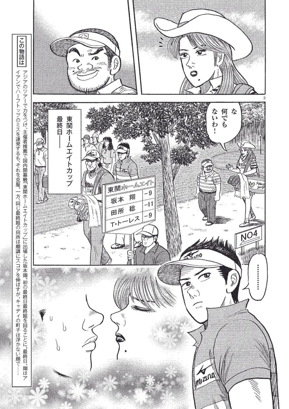 アジアのツアーで力をつけ、主催者推薦で国内開幕戦「東関ホームエイトカップ」に出場した坂本翔。初の最終日最終組を回ることに。最終日、翔はアイアンでハーフトップのミスを連発するも、それを克服。一方、同じ最終組の田所は順調にスコアを伸ばすが、キャディの町子は浮かない顔で……