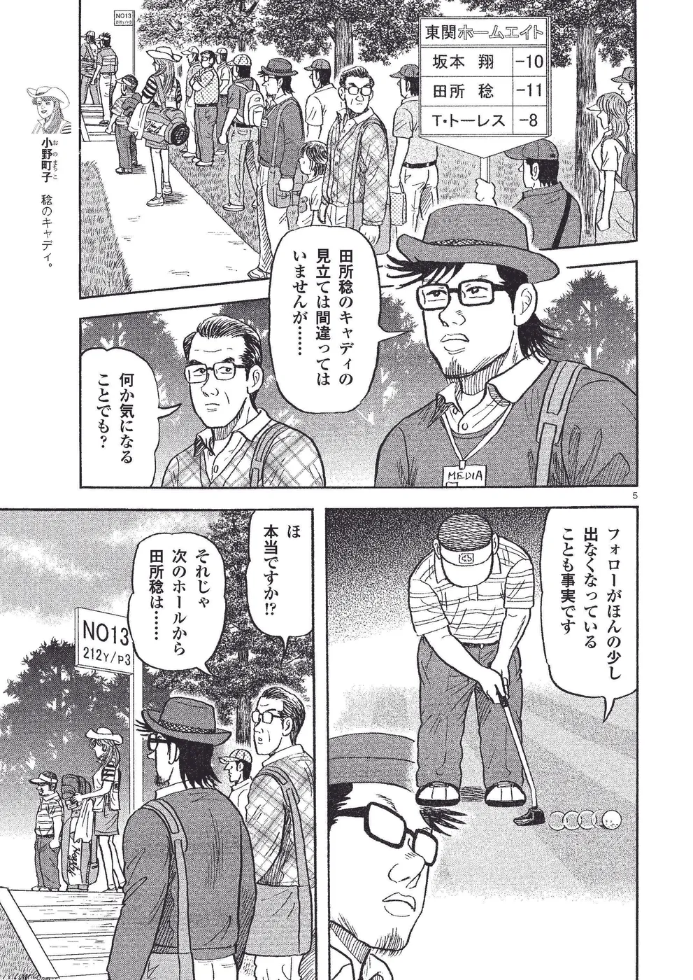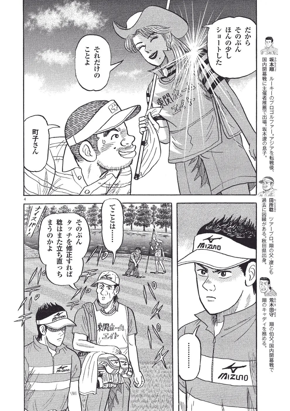 アジアのツアーで力をつけ、主催者推薦で国内開幕戦「東関ホームエイトカップ」に出場した坂本翔。スコアを伸ばして最終日最終組を回ることに。最終日、優勝争いの中の11番ホール、アプローチのダルマ落としから翔は1打落として後退。優勝を争う田所は、パッティングをショート。プレッシャーがショートの原因と思い……
