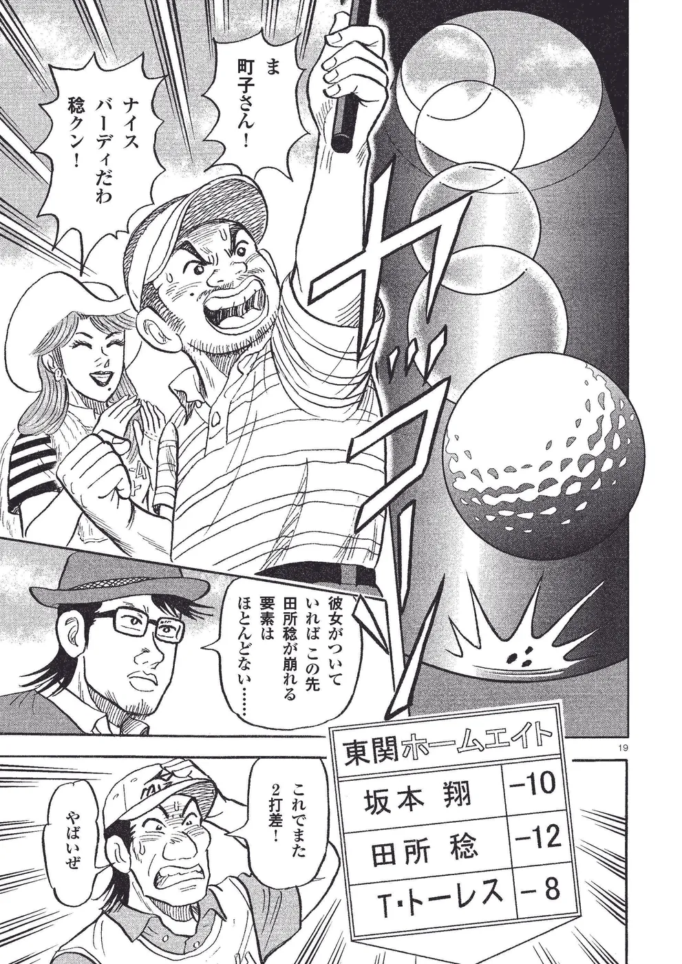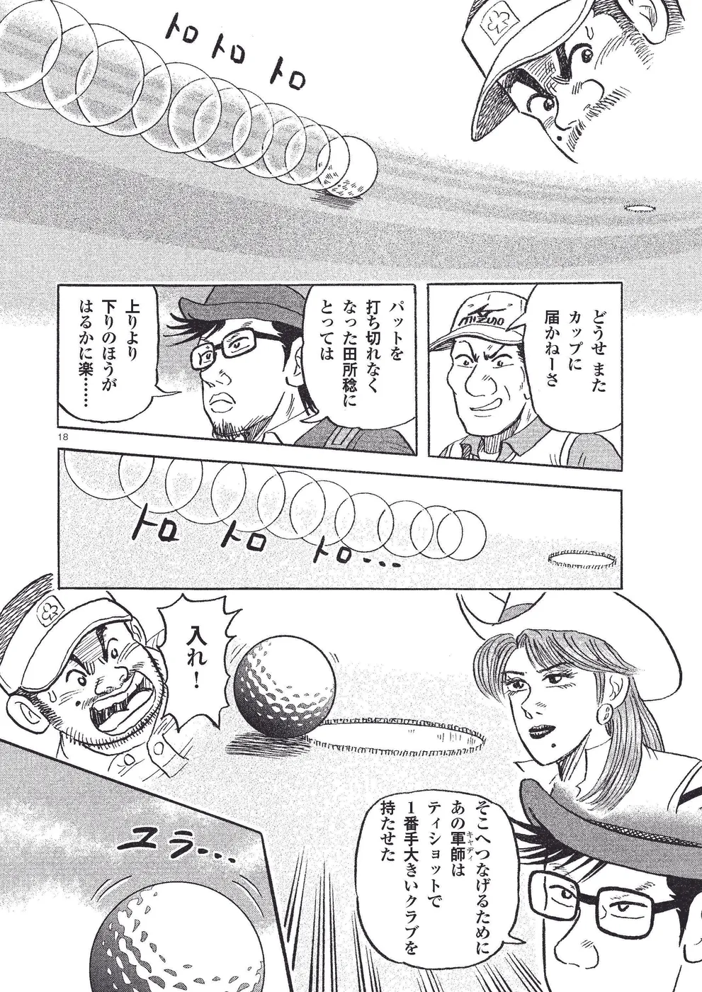 アジアのツアーで力をつけ、主催者推薦で国内開幕戦「東関ホームエイトカップ」に出場した坂本翔。スコアを伸ばして最終日最終組を回ることに。最終日、優勝争いの中の11番ホール、アプローチのダルマ落としから翔は1打落として後退。優勝を争う田所は、パッティングをショート。プレッシャーがショートの原因と思い……