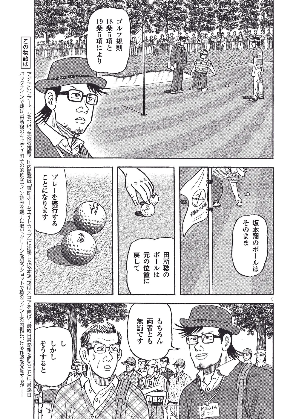 アジアのツアーで力をつけ、主催者推薦で国内開幕戦「東関ホームエイトカップ」に出場した坂本翔。翔はスコアを伸ばし最終日最終組を回ることに。最終日バックナインで翔は、田所稔のキャディ・町子の的確なライン読みを逆手に取り、グリーンを狙うショットで稔のライン上の内側につける作戦を発動するが……