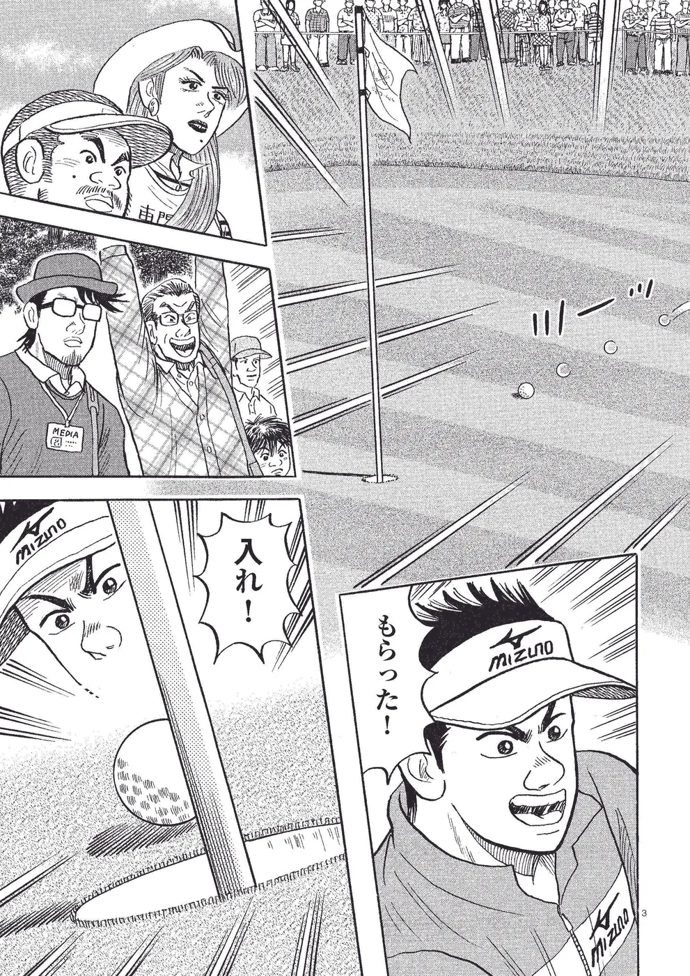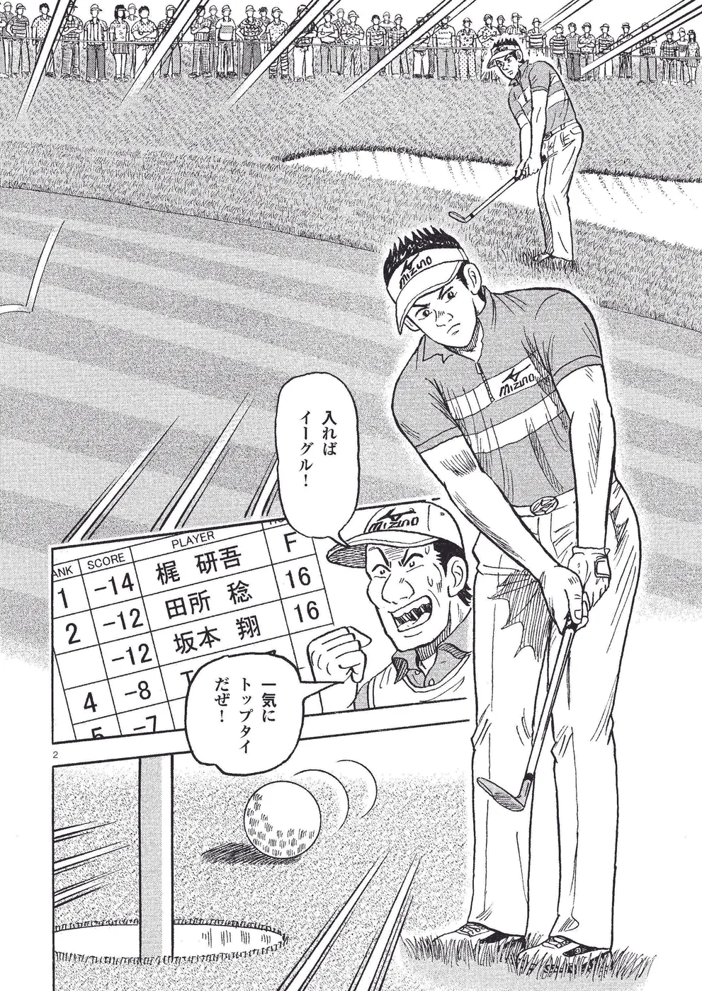 国内開幕戦「東関ホームエイトカップ」。最終日最終組の坂本翔は16番でバーディを奪い、12アンダーでトップの田所稔に追いつくことに成功。しかし謎のルーキー・梶研吾が14アンダーでフィニッシュしているのを知る翔。田所が崩れる中、17番ホールのグリーン周りからイーグルトライをする翔だが……