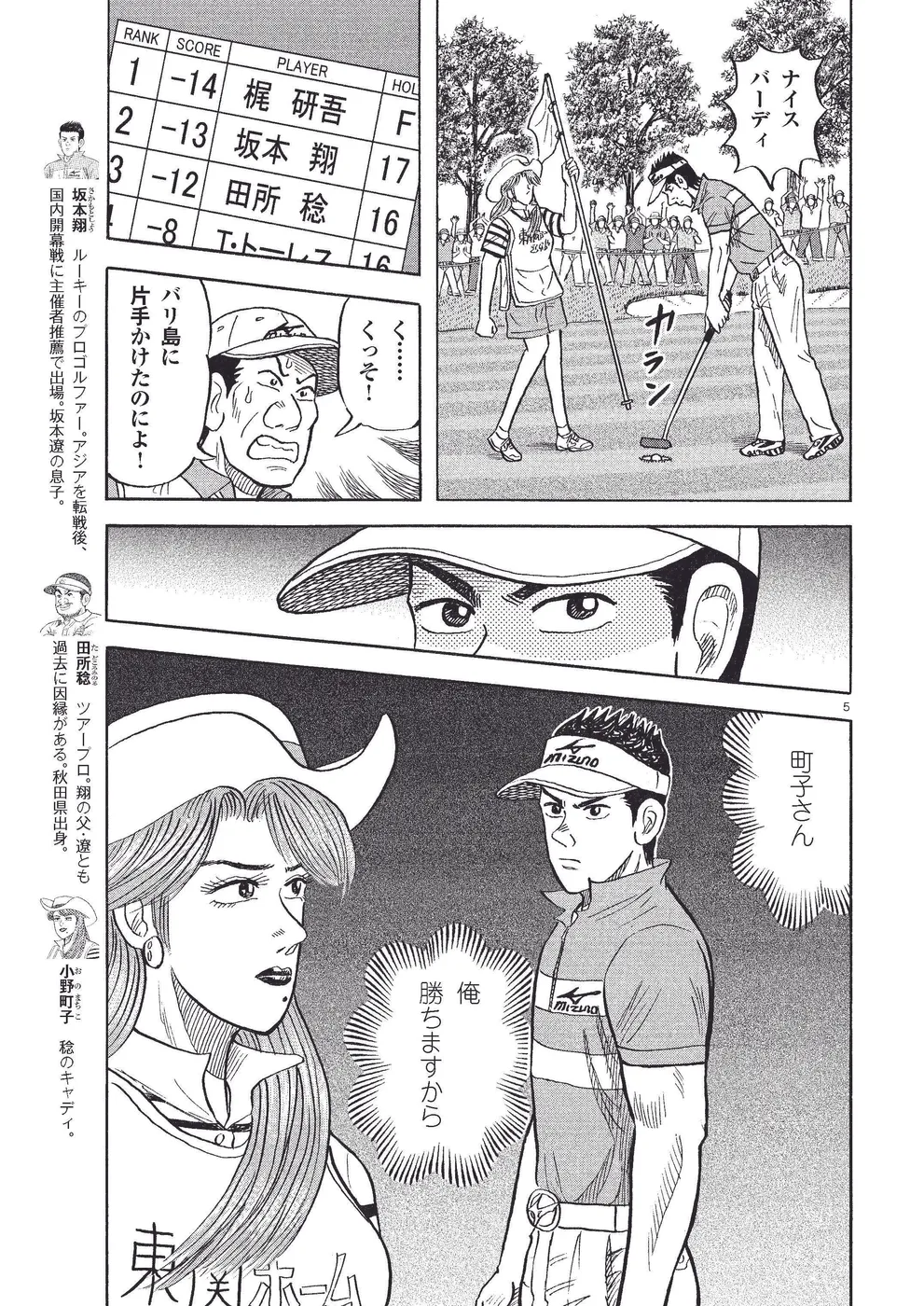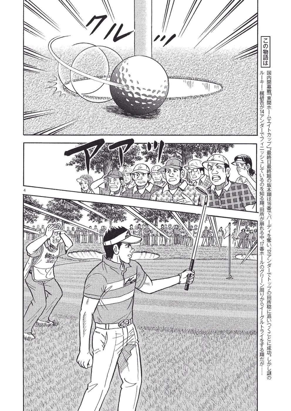 国内開幕戦「東関ホームエイトカップ」。最終日最終組の坂本翔は16番でバーディを奪い、12アンダーでトップの田所稔に追いつくことに成功。しかし謎のルーキー・梶研吾が14アンダーでフィニッシュしているのを知る翔。田所が崩れる中、17番ホールのグリーン周りからイーグルトライをする翔だが……