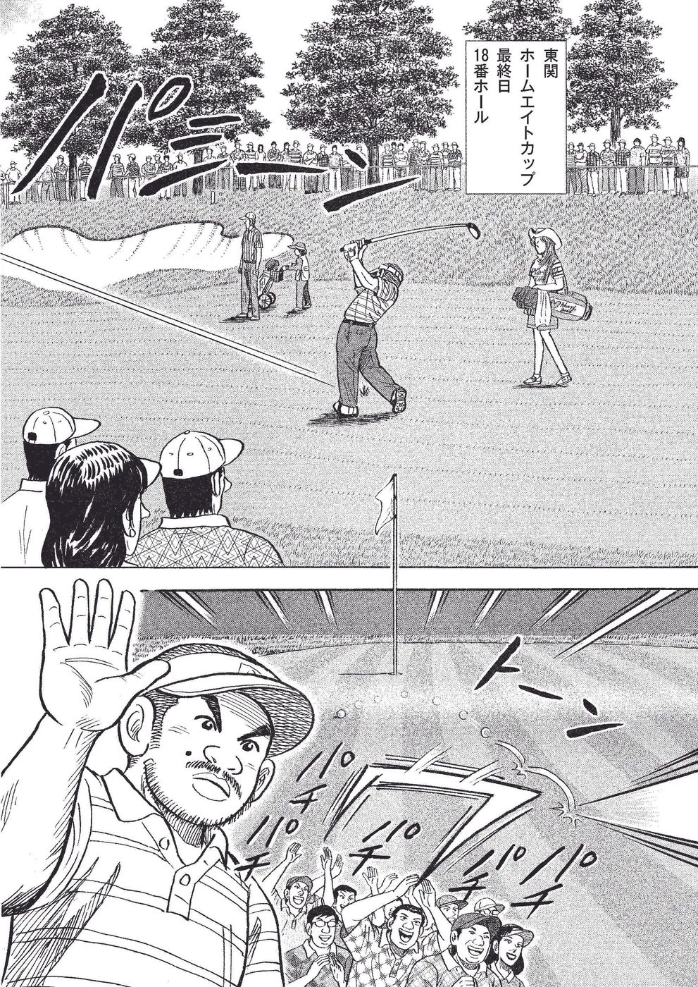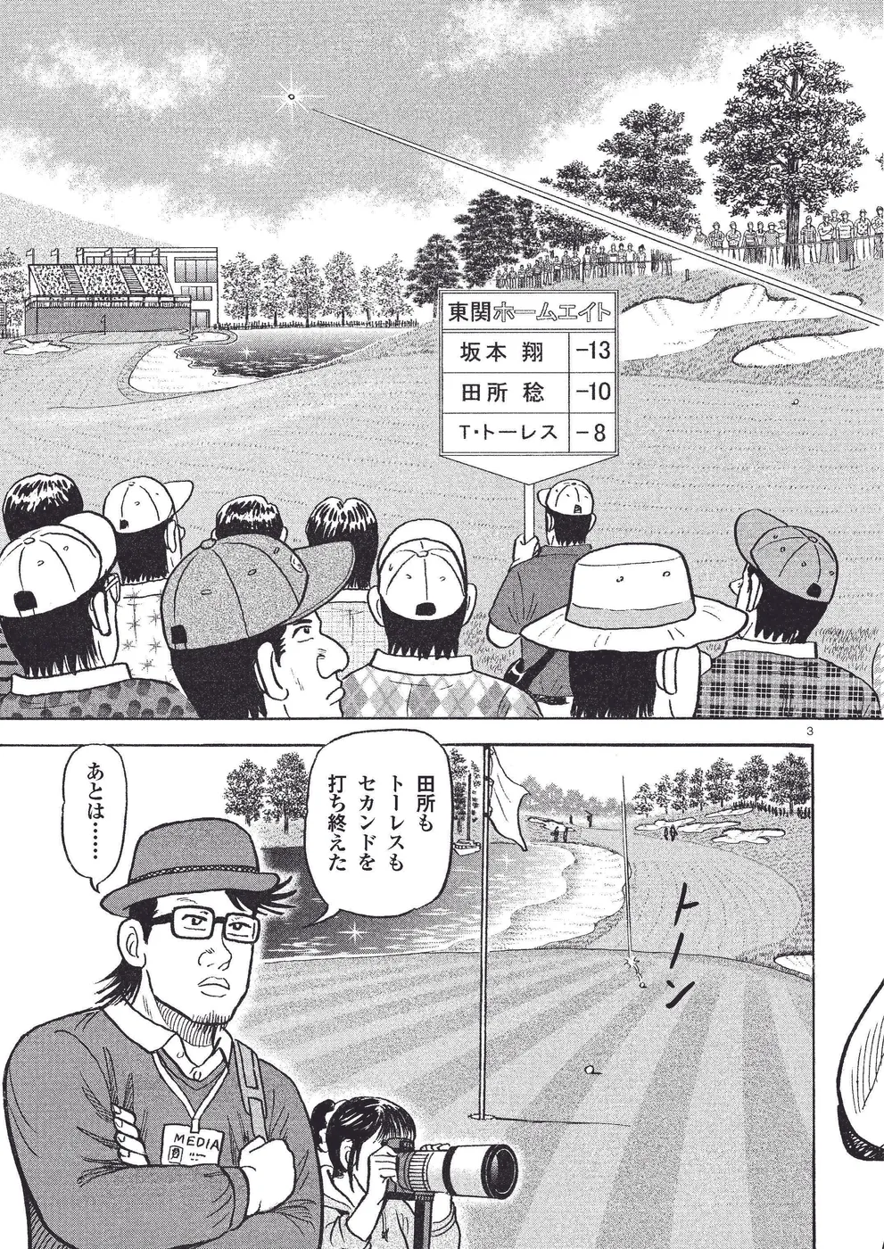 国内開幕戦「東関ホームエイトカップ」。最終日最終組の坂本翔は、クラブハウスリーダーの梶研吾を追う展開に。同組の田所稔が優勝争いから脱落する中、17番のバーディで翔は梶と1打差に迫る。最終18 番、ティショットで飛距離を稼ごうとスーパーマン振りをする翔だが、排水溝で跳ねボールはとんでもないライに……