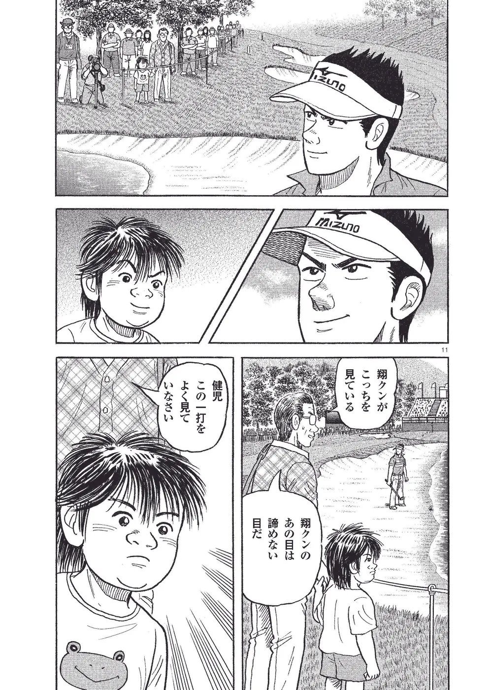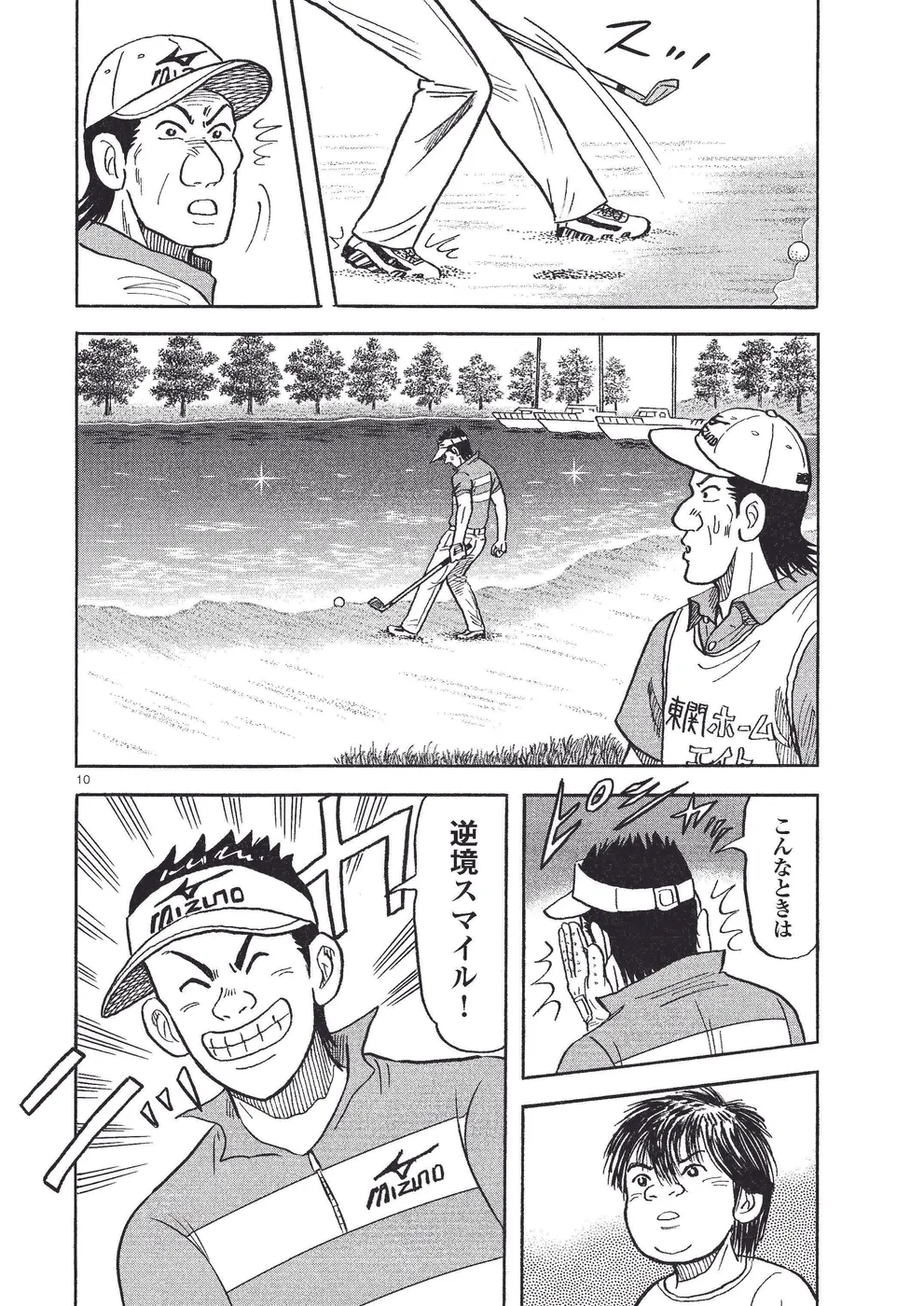 国内開幕戦「東関ホームエイトカップ」。最終日最終組の坂本翔は、クラブハウスリーダーの梶研吾を追う展開に。同組の田所稔が優勝争いから脱落する中、17番のバーディで翔は梶と1打差に迫る。最終18 番、ティショットで飛距離を稼ごうとスーパーマン振りをする翔だが、排水溝で跳ねボールはとんでもないライに……