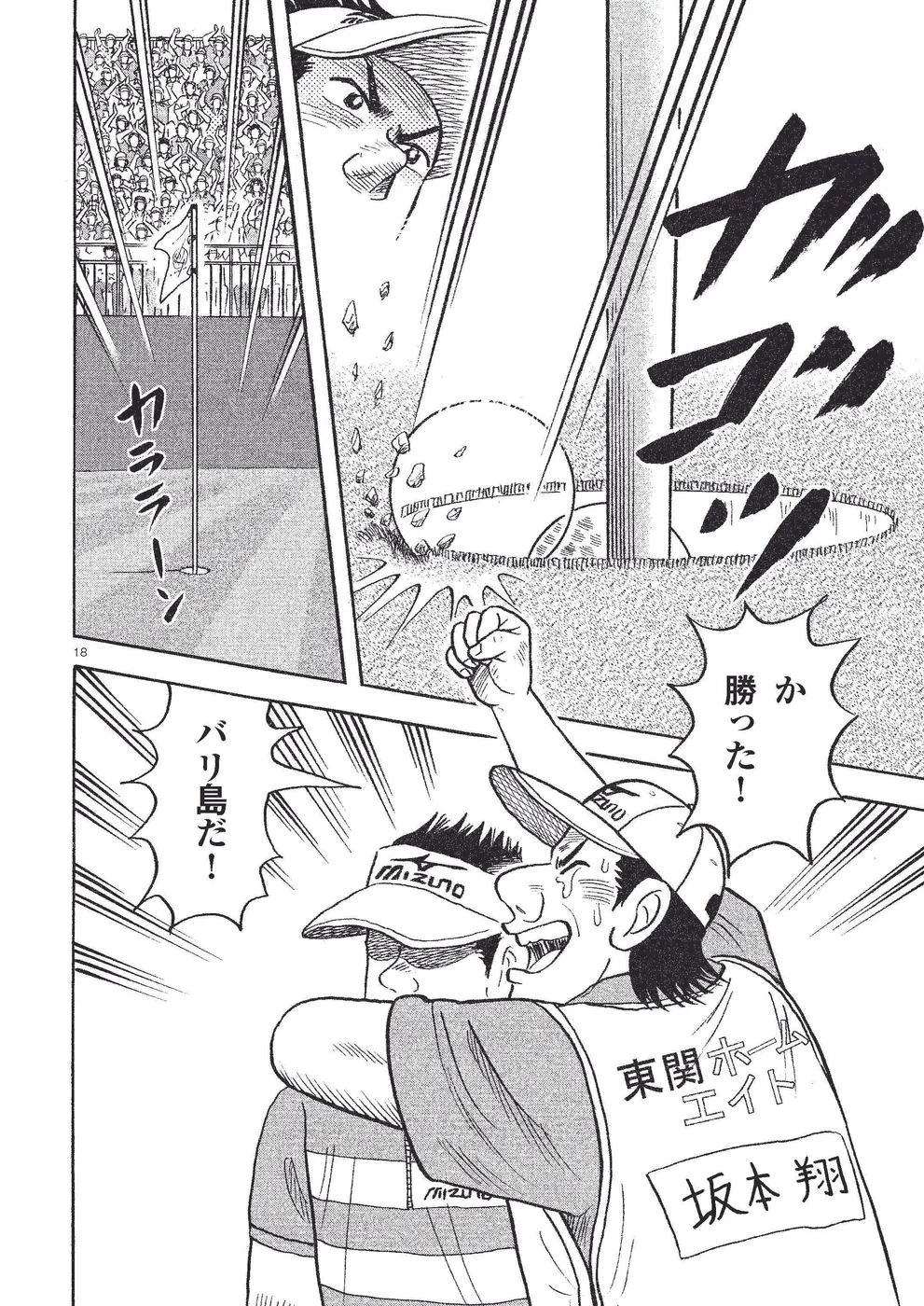 国内開幕戦「東関ホームエイトカップ」。最終日最終組の坂本翔は、クラブハウスリーダーの梶研吾を追う展開に。同組の田所稔が優勝争いから脱落する中、17番のバーディで翔は梶と1打差に迫る。最終18 番、ティショットで飛距離を稼ごうとスーパーマン振りをする翔だが、排水溝で跳ねボールはとんでもないライに……