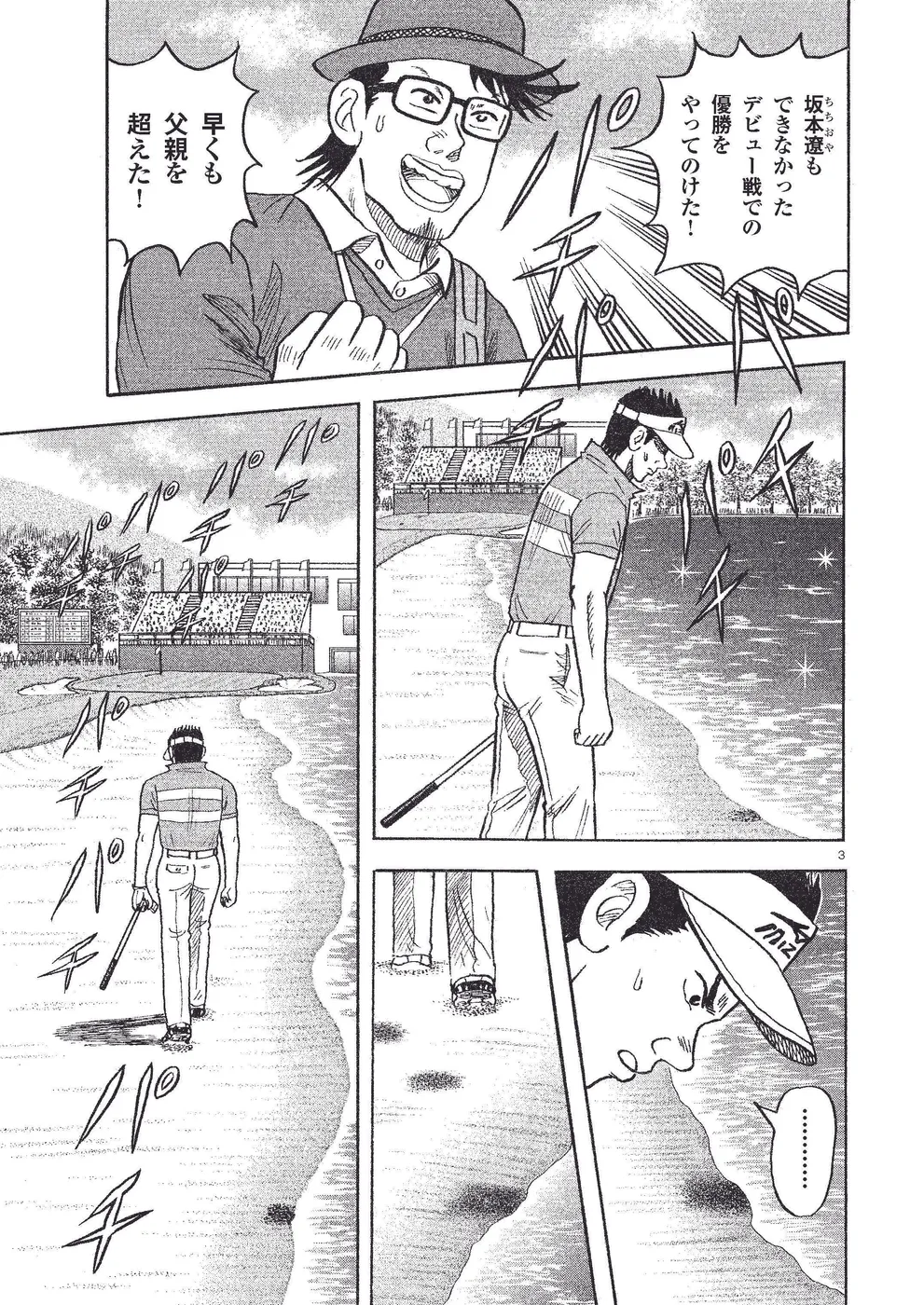 国内開幕戦「東関ホームエイトカップ」。最終日最終組の坂本翔は、クラブハウスリーダーの梶研吾を追う展開に。同組の田所稔が優勝争いから脱落する中、1打差で迎えた最終18番の2打目は半分池、半分バンカーというとんでもないライ。振り抜いた翔のショットは直接チップイン! イーグルで逆転優勝のハズが……