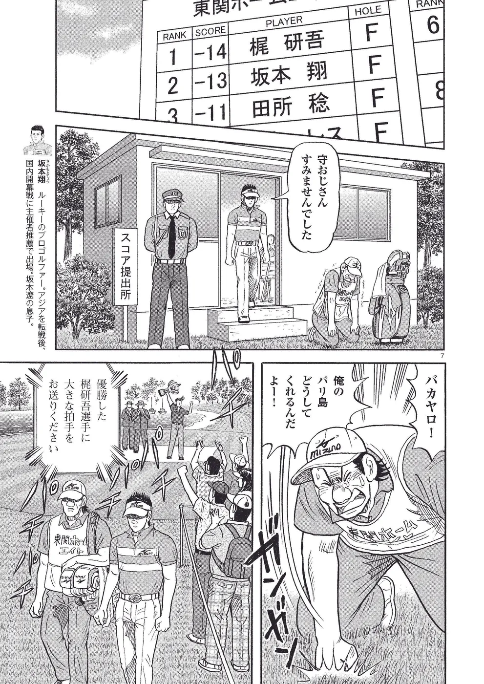 国内開幕戦「東関ホームエイトカップ」。最終日最終組の坂本翔は、クラブハウスリーダーの梶研吾を追う展開に。同組の田所稔が優勝争いから脱落する中、1打差で迎えた最終18番の2打目は半分池、半分バンカーというとんでもないライ。振り抜いた翔のショットは直接チップイン! イーグルで逆転優勝のハズが……