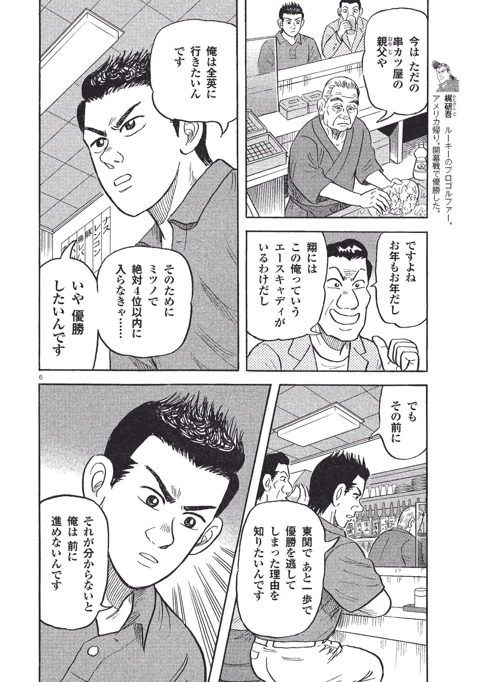 国内開幕戦「東関ホームエイトカップ」で最終18番、坂本翔が難しいライから打った2打目はなんと直接カップイン。逆転優勝かと思いきや、翔はペナルティを自己申告して惜しくも2位になってしまう。師匠の猪俣隆三は、敗因は自己申告ではないという。「ミツノオープン」を前に翔は答えを求めて大阪に向かうが……