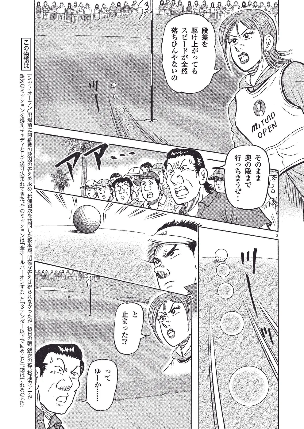 「ミツノオープン」出場前に開幕戦の敗因の答えを求め、松浦銀次を訪問した坂本翔。明確な答えは得られなかったが、初日の朝、銀次の孫、松浦カンナが銀次のミッションを携えキャディとして送り込まれてきた。そのミッションは「全ホールパーオンすな」と「3アンダー以下で回ること」。翔は守れるのか!?