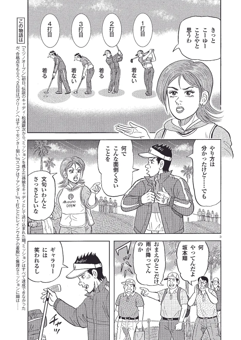 「ミツノオープン」初日、伝説のキャディ・松浦銀次から、ミッションを携えた孫娘をキャディとして送り込まれた翔。ミッションはすべて達成できなかったが、合格点をもらう。2日目は「グリーンへはすべてセンター狙い」「スコアは7アンダー」「1打ごとにレインウエアの着脱」と無理なミッションに翔は……