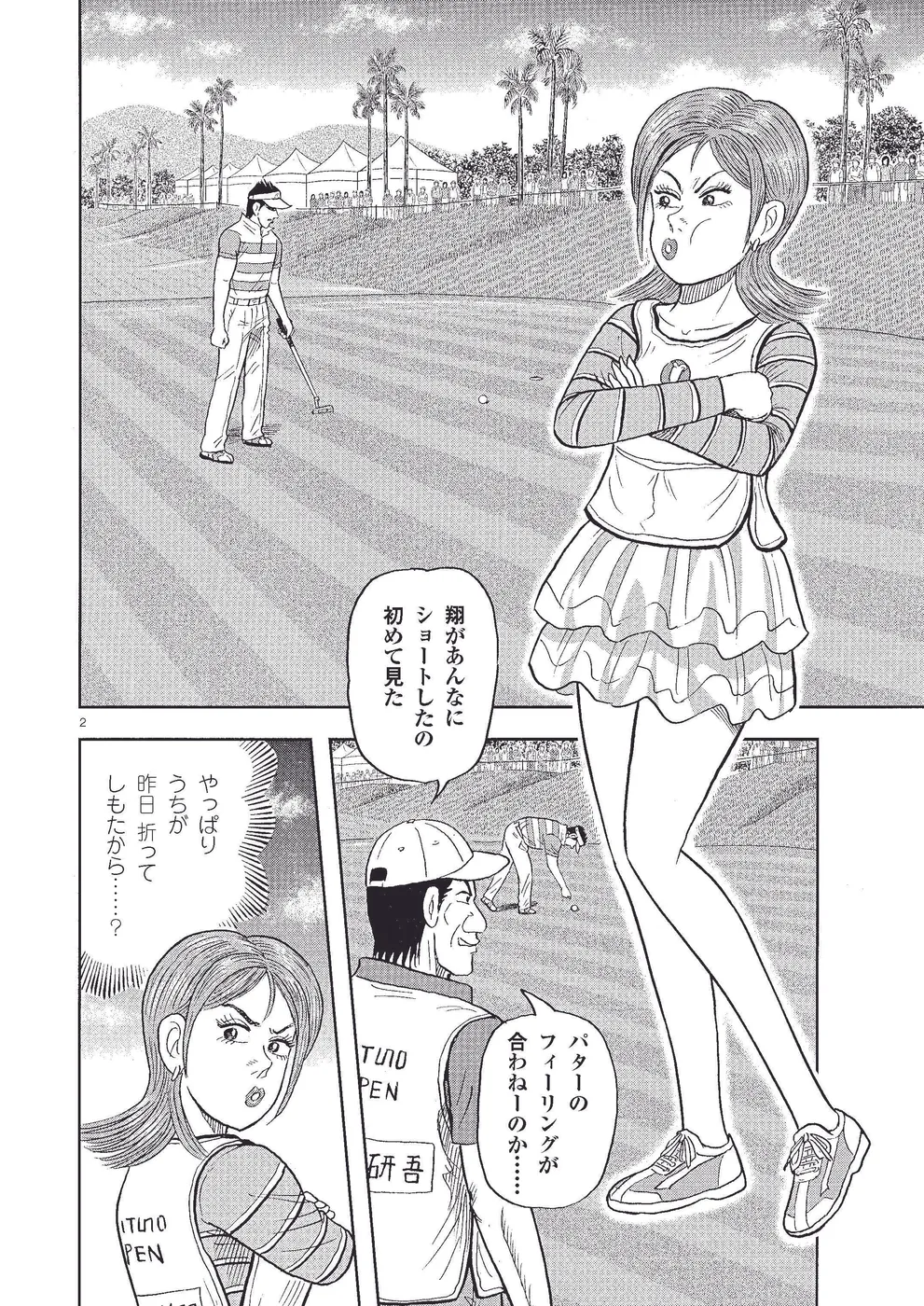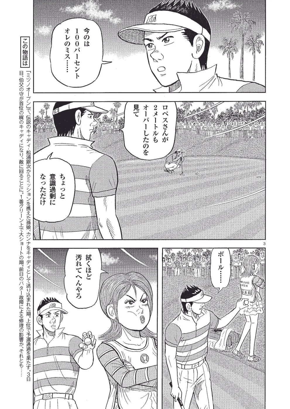 「ミツノオープン」で、伝説のキャディ・松浦銀次からミッションを携えた孫娘、カンナをキャディとして送り込まれた翔。上位で予選通過を果たす。2日目、伯父の守が首位の梶のキャディになり、敵に回ることに。1番グリーン上で大ショートの翔。前日のパター故障による修理の影響か、それとも……