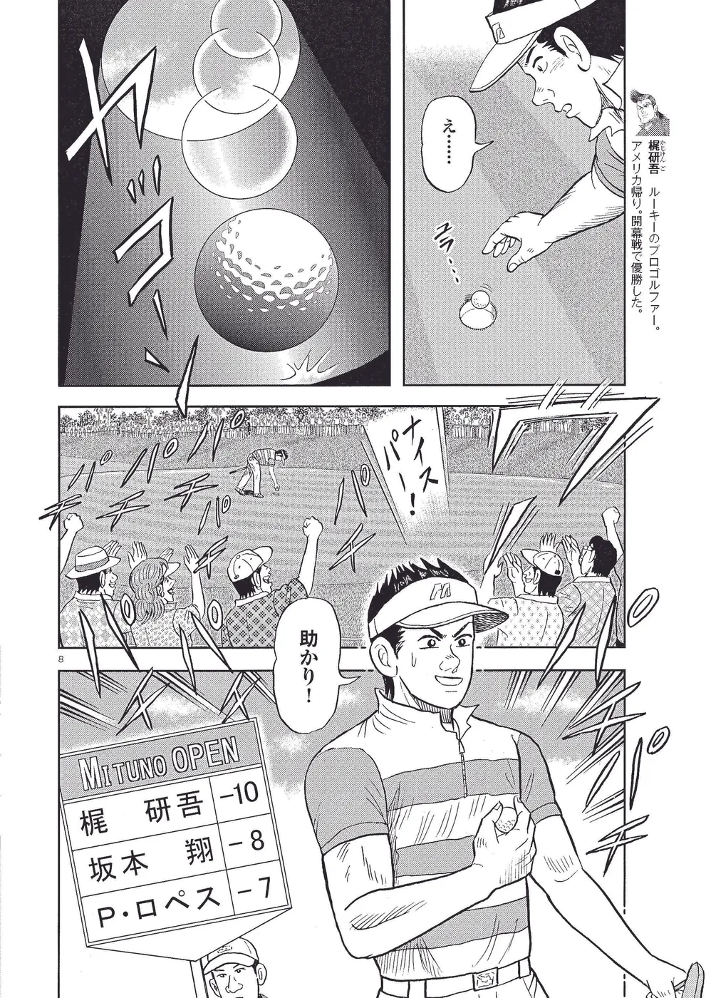 「ミツノオープン」で、伝説のキャディ・松浦銀次からミッションを携えた孫娘、カンナをキャディとして送り込まれた翔。上位で予選通過を果たす。2日目、伯父の守が首位の梶のキャディになり、敵に回ることに。1番グリーン上で大ショートの翔。前日のパター故障による修理の影響か、それとも……