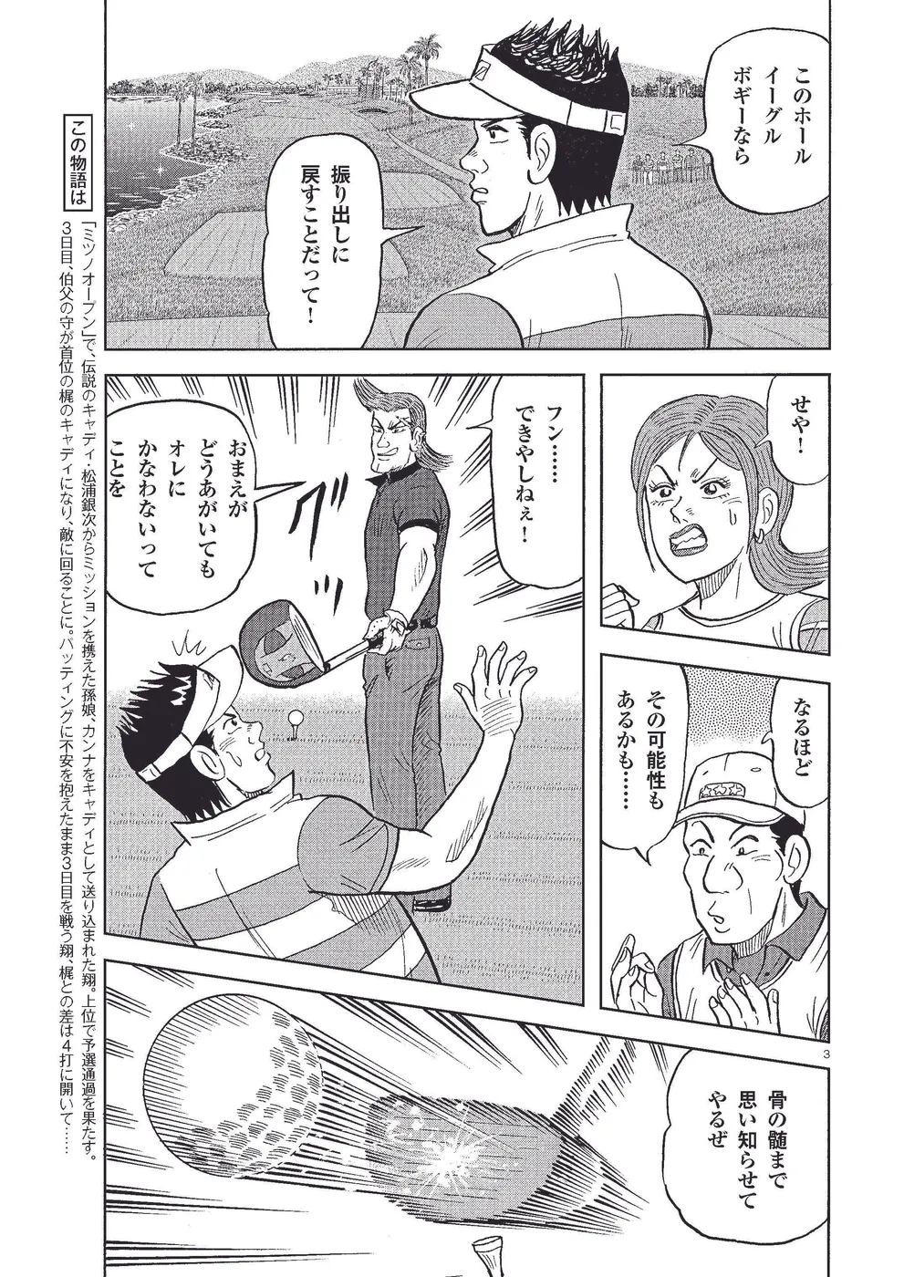 「ミツノオープン」で、伝説のキャディ・松浦銀次からミッションを携えた孫娘、カンナをキャディとして送り込まれた翔。上位で予選通過を果たす。3日目、伯父の守が首位の梶のキャディになり、敵に回ることに。パッティングに不安を抱えたまま3日目を戦う翔、梶との差は4打に開いて……