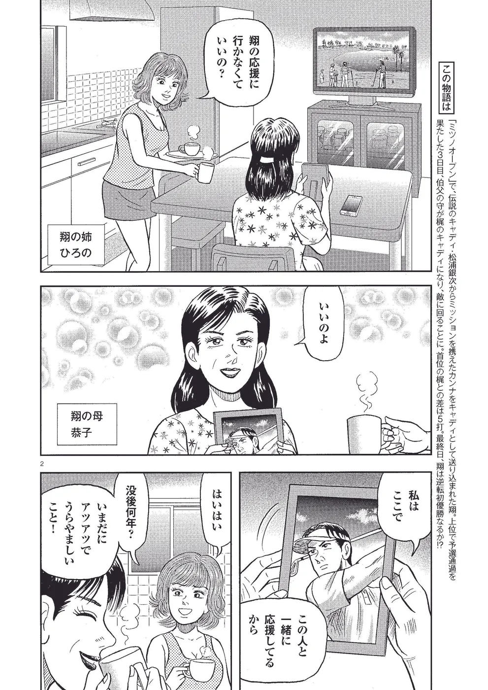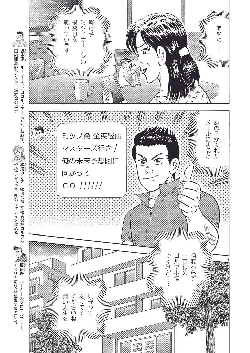 「ミツノオープン」で、伝説のキャディ・松浦銀次からミッションを携えたカンナをキャディとして送り込まれた翔。上位で予選通過を果たした3日目、伯父の守が梶のキャディになり、敵に回ることに。首位の梶との差は5打。最終日、翔は逆転初優勝なるか!?