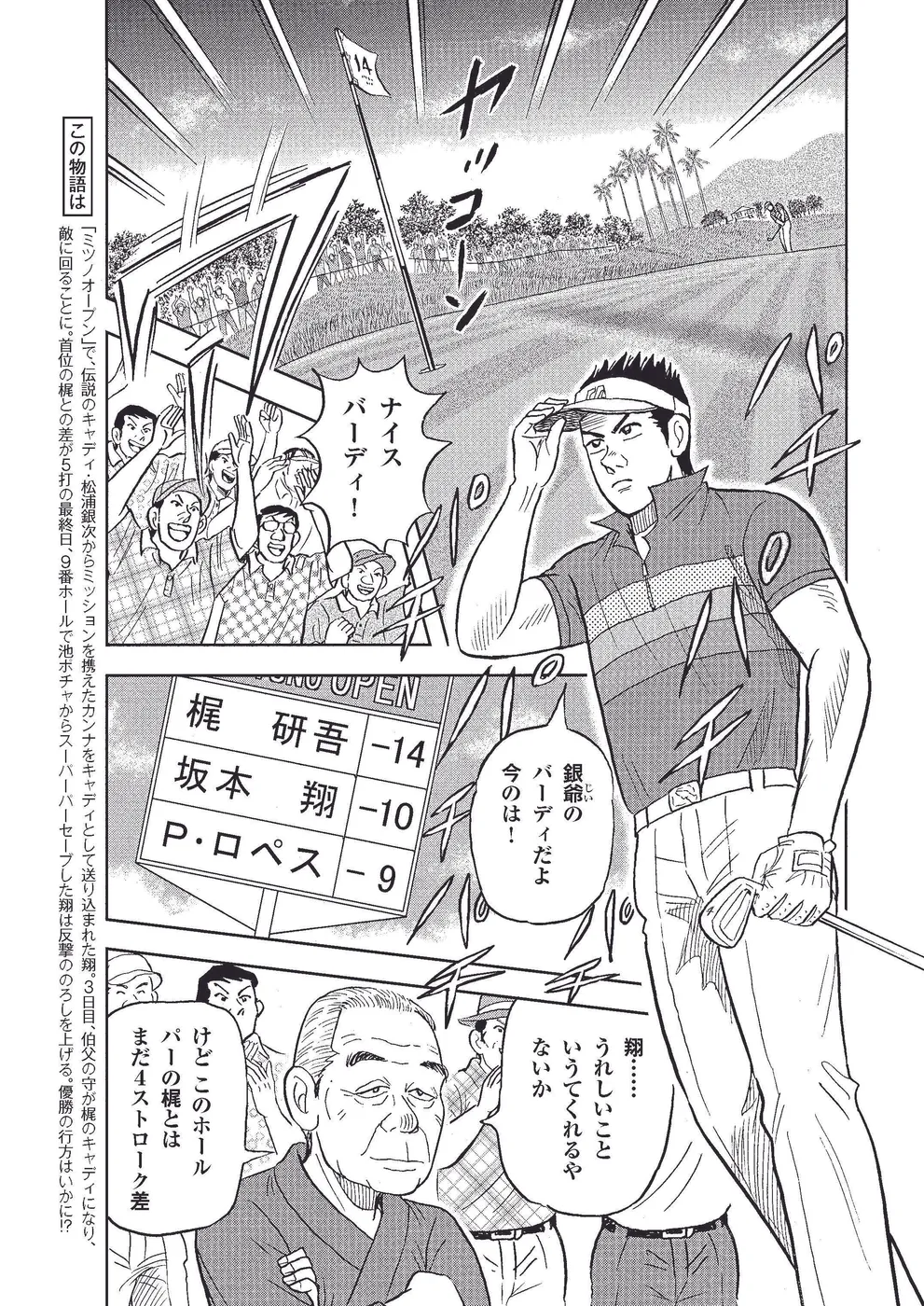 「ミツノオープン」で、伝説のキャディ・松浦銀次からミッションを携えたカンナをキャディとして送り込まれた翔。3日目、伯父の守が梶のキャディになり、敵に回ることに。首位の梶との差が5打の最終日、9番ホールで池ポチャからスーパーパーセーブした翔は反撃ののろしを上げる。優勝の行方はいかに!?