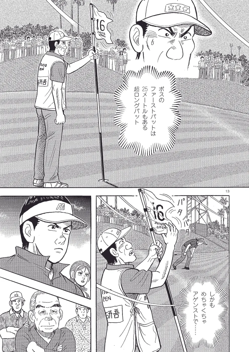 「ミツノオープン」で、伝説のキャディ・松浦銀次からミッションを携えたカンナをキャディとして送り込まれた翔。3日目、伯父の守が梶のキャディになり、敵に回ることに。首位の梶と一騎打ちの最終日終盤、3打差に迫った翔は、16番パー3でベタピンにつけて、事実上、梶との差を2打にするが……