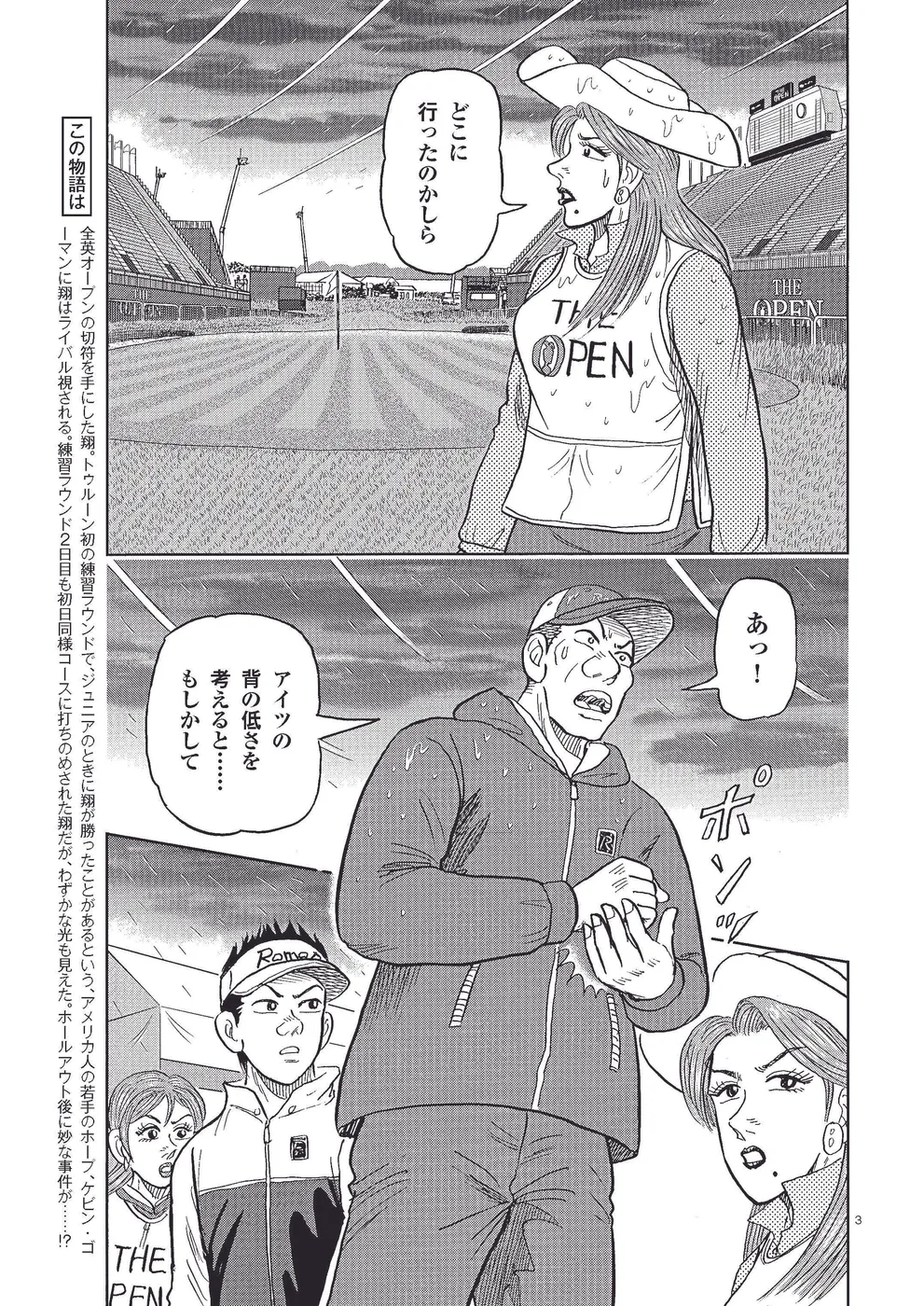 全英オープンの切符を手にした翔。トゥルーン初の練習ラウンドで、ジュニアのときに翔が勝ったことがあるという、アメリカ人の若手のホープ、ケビン・ゴーマンに翔はライバル視される。練習ラウンド2日目も初日同様コースに打ちのめされた翔だが、わずかな光も見えた。ホールアウト後に妙な事件が…… !?