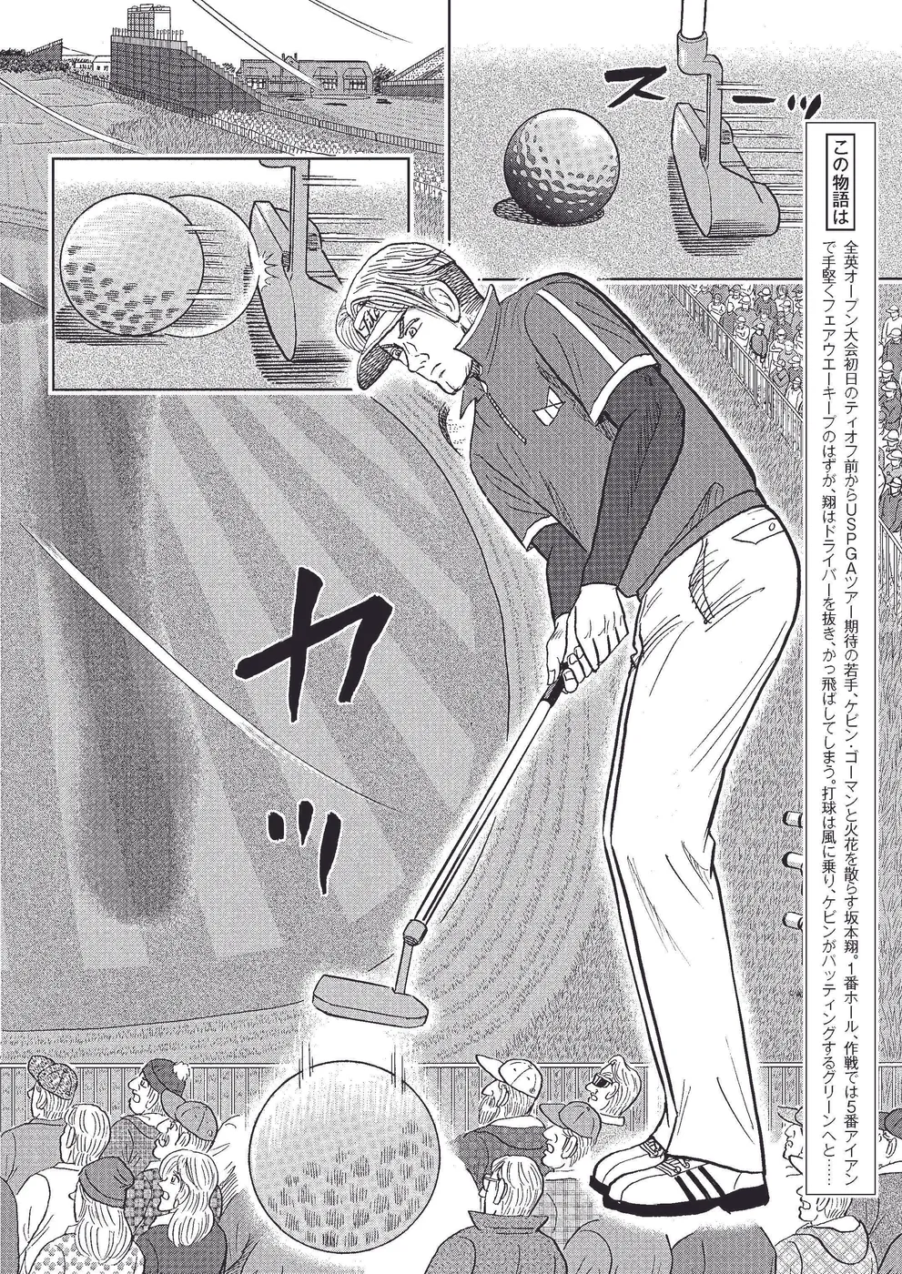 全英オープン大会初日のティオフ前からUSPGAツアー期待の若手、ケビン・ゴーマンと火花を散らす坂本翔。1番ホール、作戦では5番アイアンで手堅くフェアウエーキープのはずが、翔はドライバーを抜き、かっ飛ばしてしまう。打球は風に乗り、ケビンがパッティングするグリーンへと……