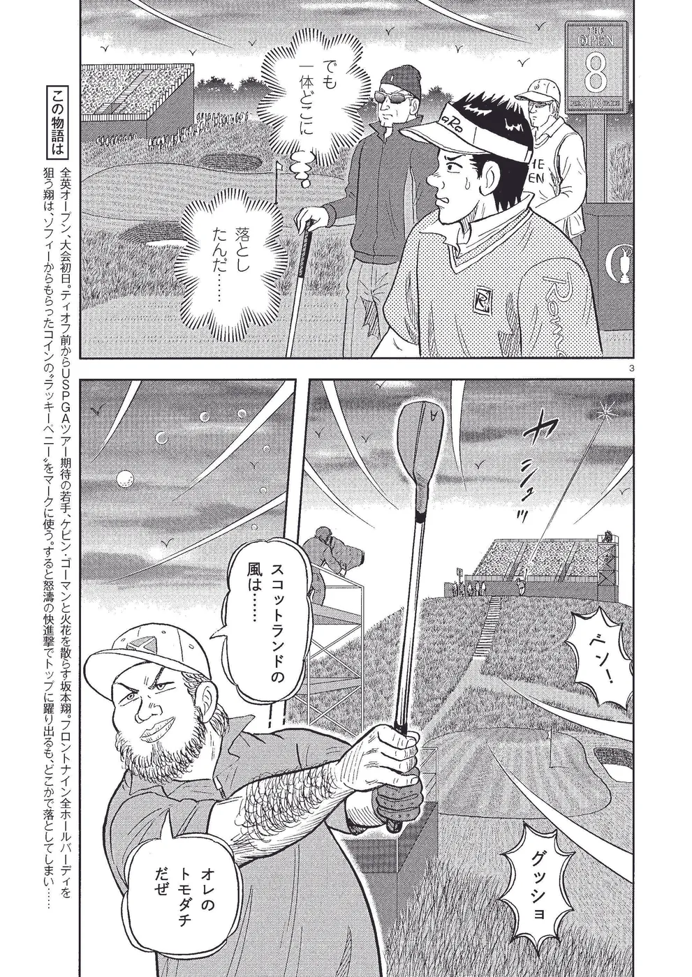全英オープン、大会初日。ティオフ前からUSPGAツアー期待の若手、ケビン・ゴーマンと火花を散らす坂本翔。フロントナイン全ホールバーディを狙う翔は、ソフィーからもらったコインの〝ラッキーペニー〟をマークに使う。すると怒濤の快進撃でトップに躍り出るも、どこかで落としてしまい……