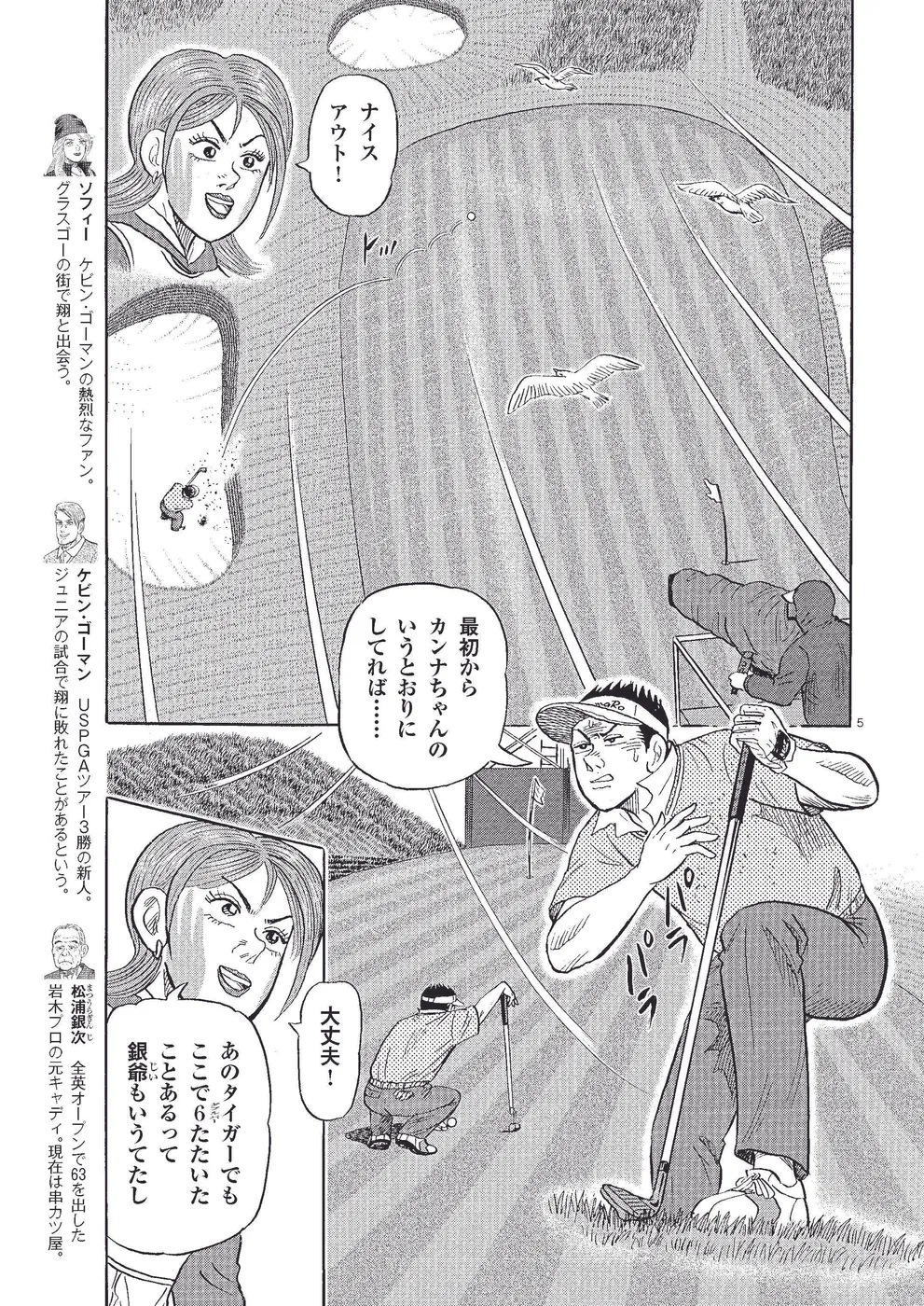 全英オープン、大会初日。ティオフ前からUSPGAツアー期待の若手、ケビン・ゴーマンと火花を散らす坂本翔。フロントナイン全ホールバーディを狙う翔は、ソフィーからもらった〝ラッキーペニー〟をマークに使い、快進撃。5アンダーで迎えた8番、バンカーからのショットを自分に当て大ピンチに!