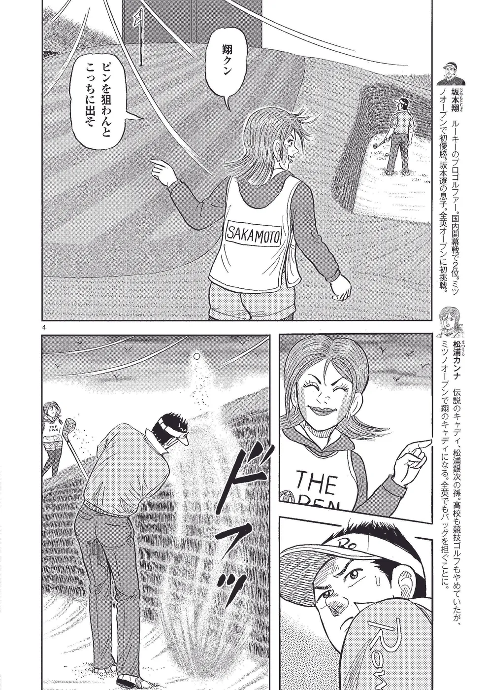 全英オープン、大会初日。ティオフ前からUSPGAツアー期待の若手、ケビン・ゴーマンと火花を散らす坂本翔。フロントナイン全ホールバーディを狙う翔は、ソフィーからもらった〝ラッキーペニー〟をマークに使い、快進撃。5アンダーで迎えた8番、バンカーからのショットを自分に当て大ピンチに!