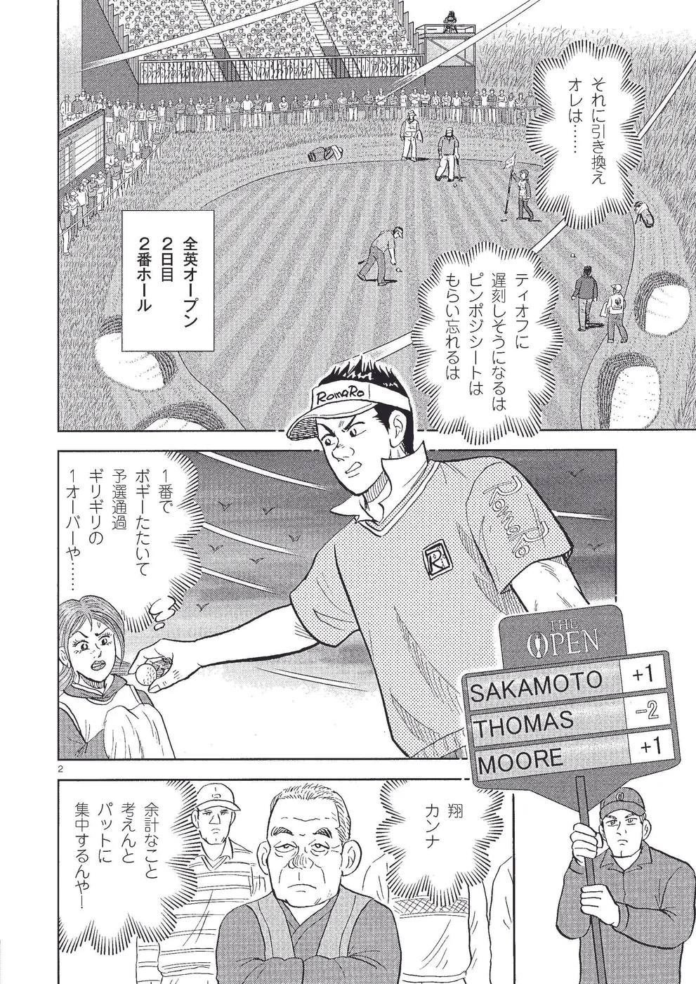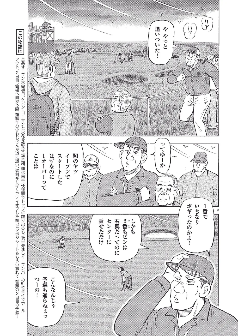 全英オープン大会初日、ケビン・ゴーマンと火花を散らす坂本翔。翔は前半、快進撃でトップに躍り出るも、後半失速しイーブンパーの51位タイでホールアウト。2日目、会場へ向かう際、運転手の守おじさんが道に迷い、遅刻ギリギリでティオフした翔。ピンポジシートももらい忘れて、苦難の2日目の予感!