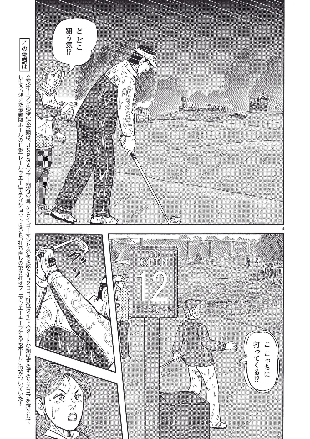 全英オープン出場の坂本翔は、USPGAツアー期待の星、ケビン・ゴーマンと火花を散らす。2日目、51位タイでスタートの翔はずるずるとスコアを落としてしまう。迎えた最難関ホールの11番「レールウエー」でティショットをOB。打ち直しの第3打はフェアウエーキープするもボールに泥がついていた!