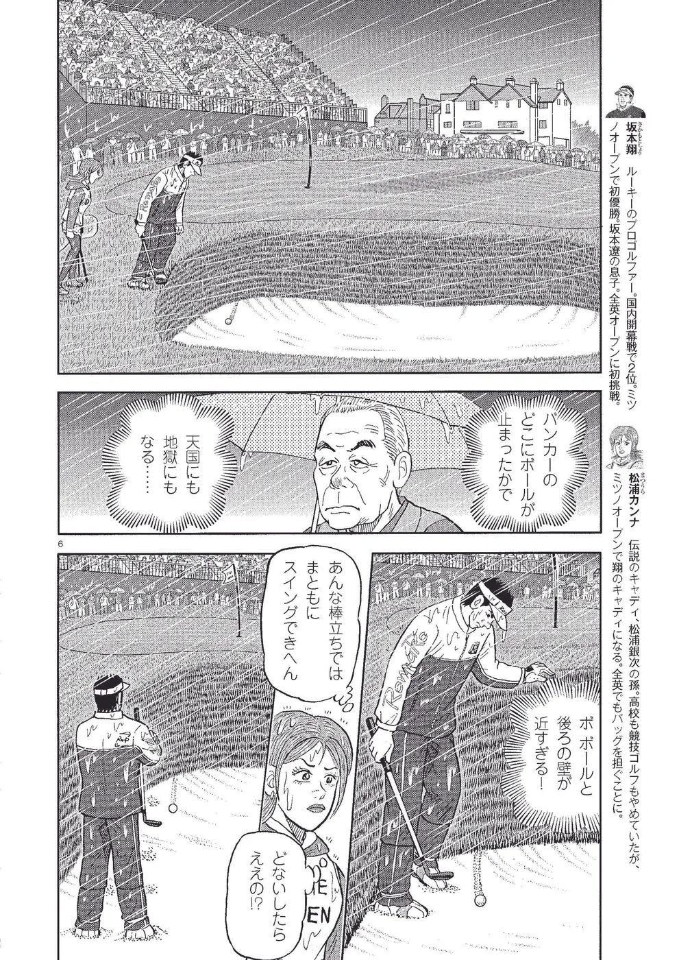 全英オープン初出場の坂本翔は、USPGAツアー期待の星、ケビン・ゴーマンと火花を散らす。2日目、51位タイでスタートの翔はずるずるとスコアを落とす。カットラインは4オーバー予想の中、7オーバーで16番パー5を迎える。ティショットを短いクラブで刻み、セカンドは直ドラで2オンを狙った翔だが……
