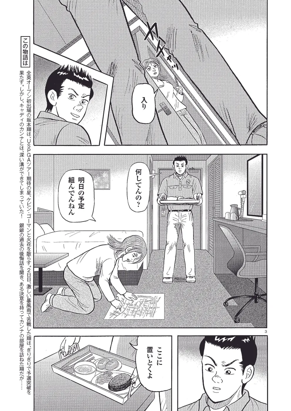 全英オープン初出場の坂本翔は、USPGAツアー期待の星、ケビン・ゴーマンと火花を散らす。2日目、激しい暴風雨で苦戦した翔は、ぎりぎりで予選突破を果たす。しかし、キャディのカンナとは、深い溝ができてしまっていた! 銀爺の過去の後悔話を聞き、ある決意を持ってカンナの部屋を訪ねた翔だが……
