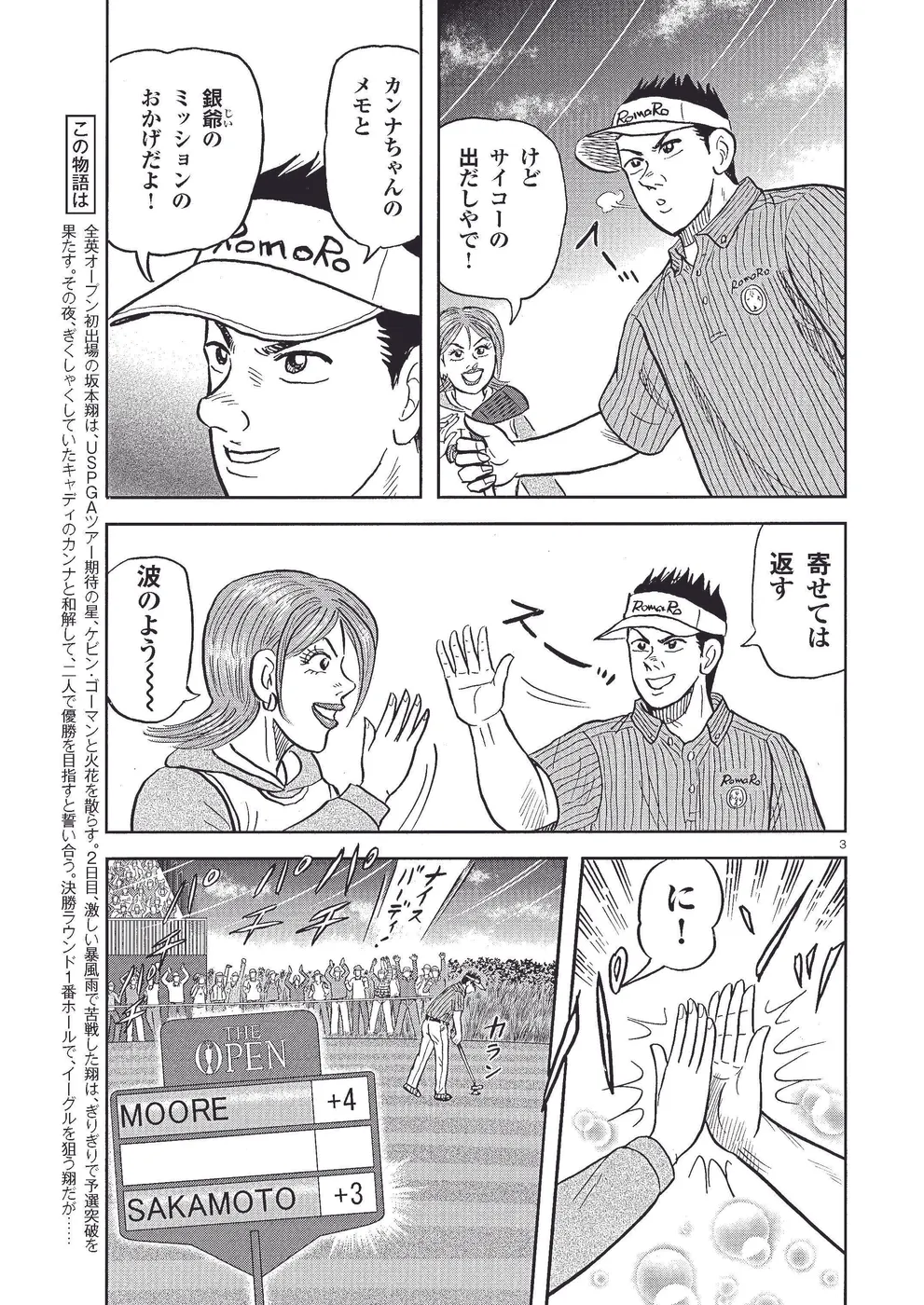 全英オープン初出場の坂本翔は、USPGAツアー期待の星、ケビン・ゴーマンと火花を散らす。2日目、激しい暴風雨で苦戦した翔は、ぎりぎりで予選突破を果たす。その夜、ぎくしゃくしていたキャディのカンナと和解して、二人で優勝を目指すと誓い合う。決勝ラウンド1番ホールで、イーグルを狙う翔だが……