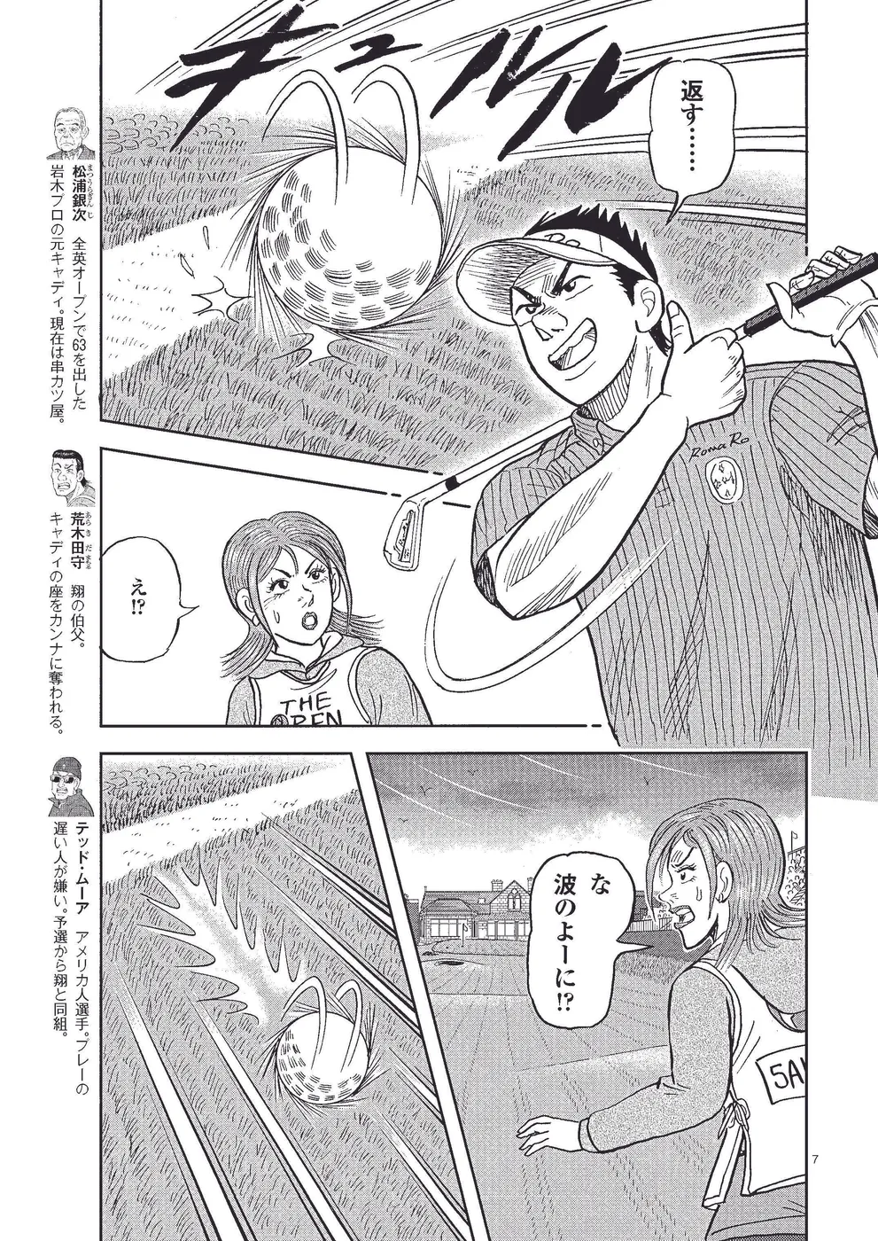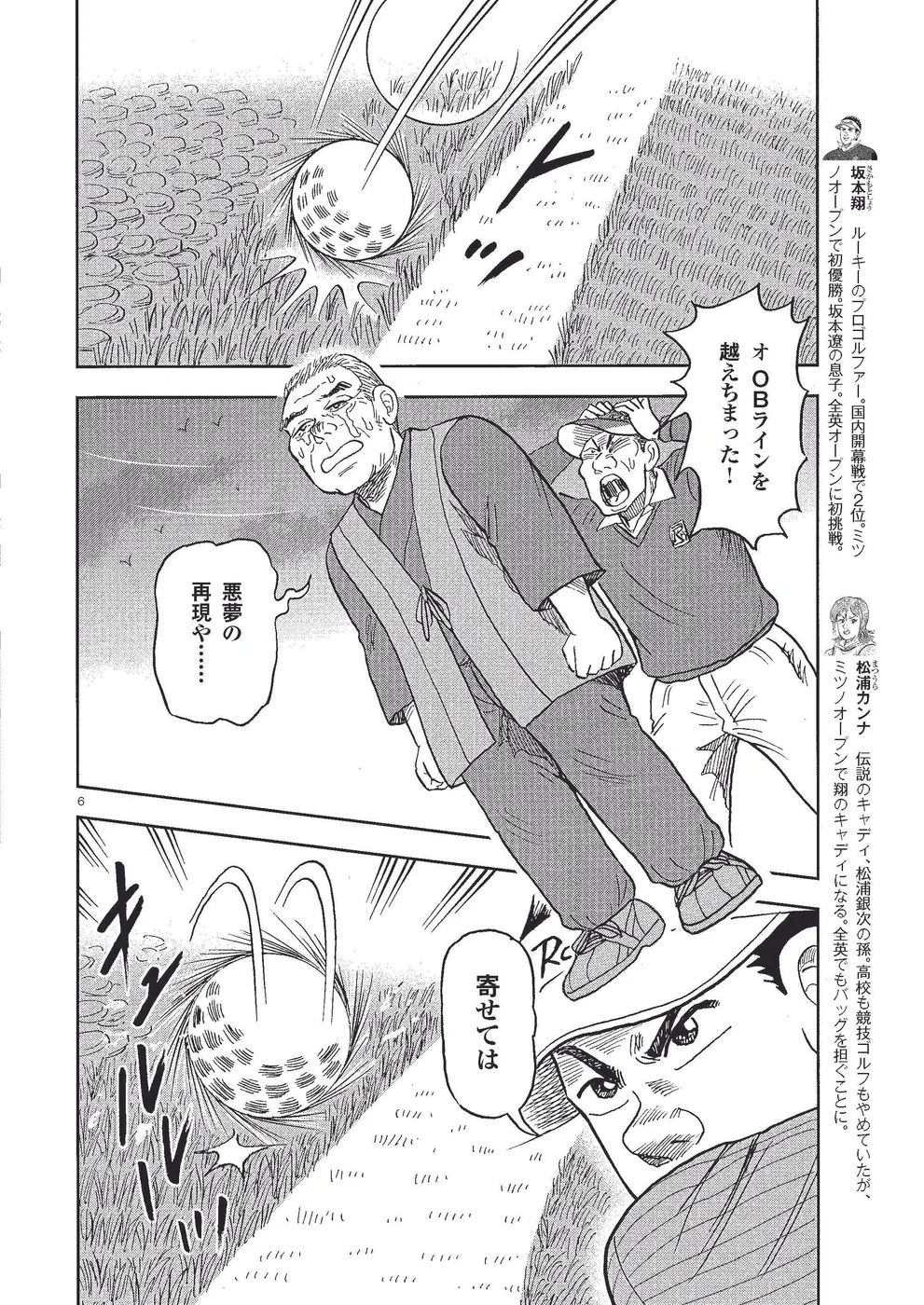 全英オープン初出場の坂本翔は、USPGAツアー期待の星、ケビン・ゴーマンと火花を散らす。ぎりぎりで予選突破を果たした翔は3日目、同伴競技者のテッドとの確執を乗り越え、17番を終えてメジャー最少スコア63の記録を塗り替えられる位置にいた。18番、翔のセカンドショットの行方は……