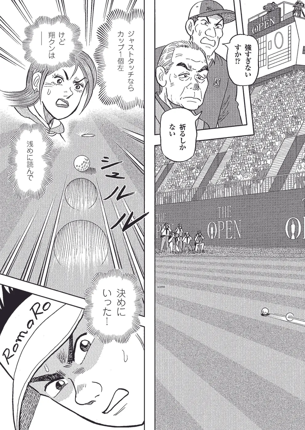 全英オープン初出場の坂本翔は、USPGAツアー期待の星、ケビン・ゴーマンと火花を散らす。ぎりぎりで予選突破を果たした翔は3日目、同伴競技者のテッドとの確執を乗り越え、メジャー最少スコアを狙える位置にいた。18番奥のOBを恐れず突っ込んでパーオン。決めれば62のパットを翔は……